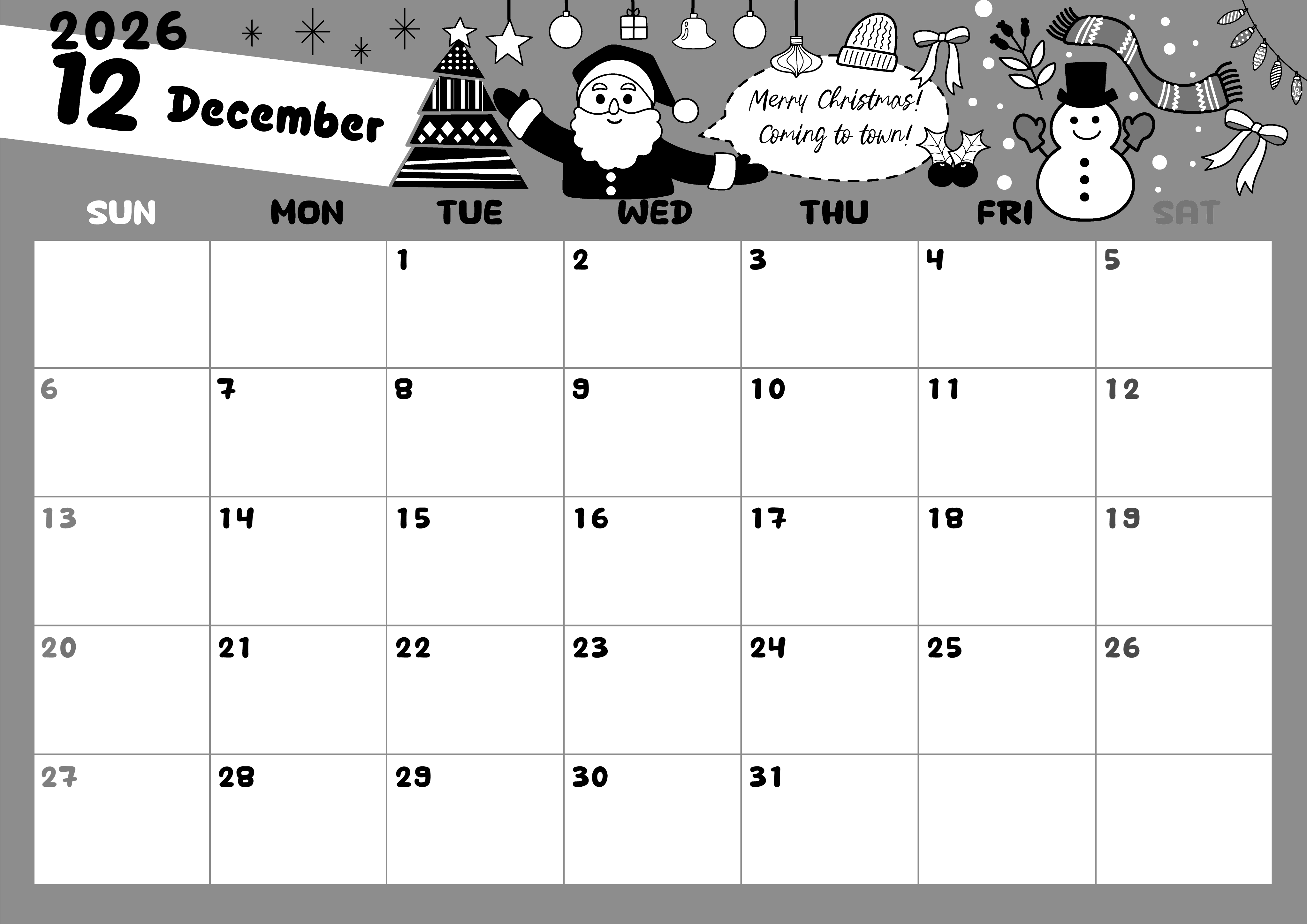 2026年12月横型モノクロの日曜始まりの無料テンプレート白黒カレンダーです。サンタやマフラーや雪だるまやクリスマスツリーやオーナメントといったグッズが目白押しの賑やかな明るいかわいいイラストとなっています。(2026-00381200)