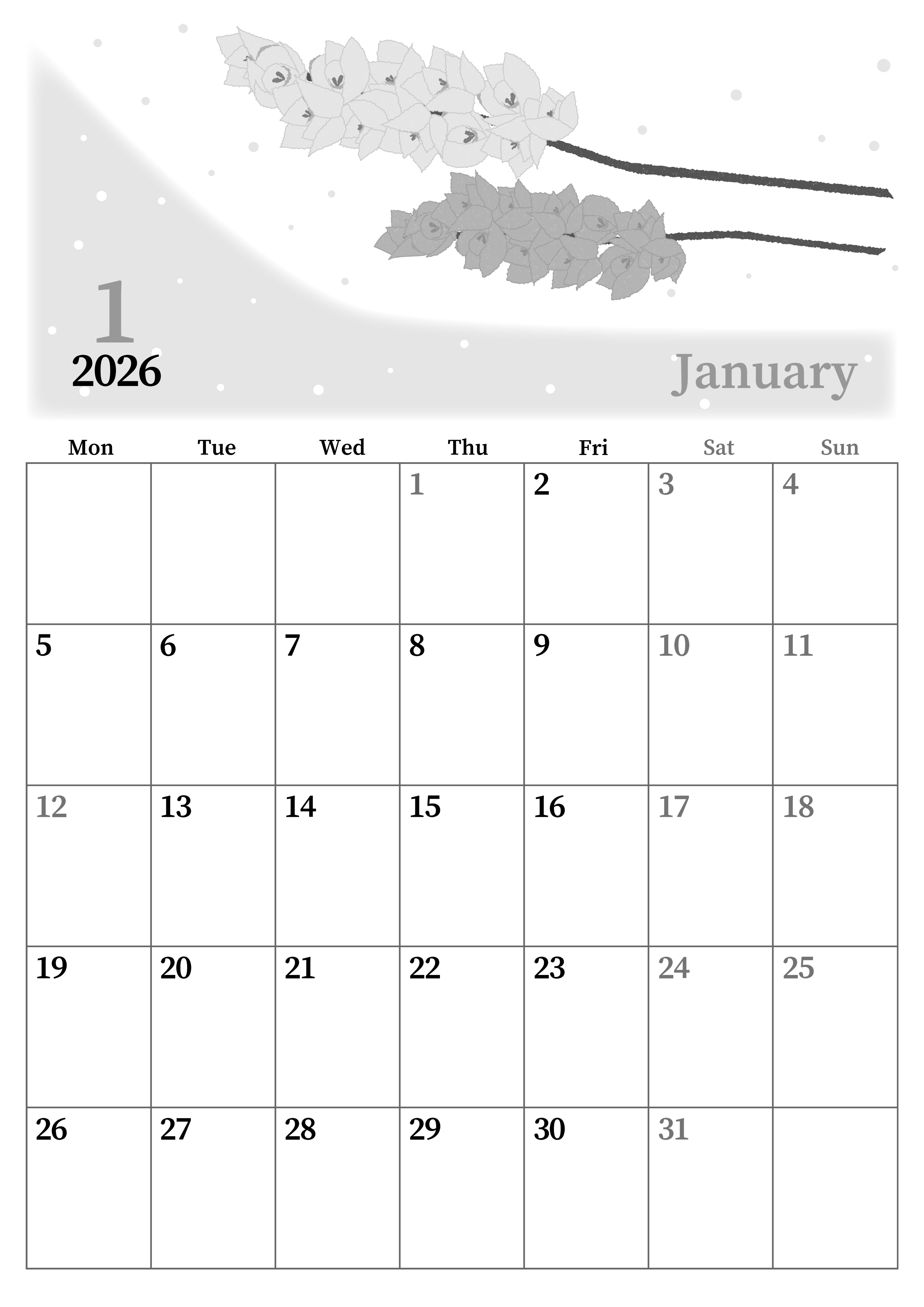 2026年1月縦型モノクロの月曜始まり白黒カレンダーです。お花が趣味だという人に使って頂きたい白黒カレンダーです。温かみのあるイラストのフリー素材です。白黒カレンダーには便利さだけでなくおしゃれさ求めているという要望にマッチしたA4フォーマットです。(2026-00390111)