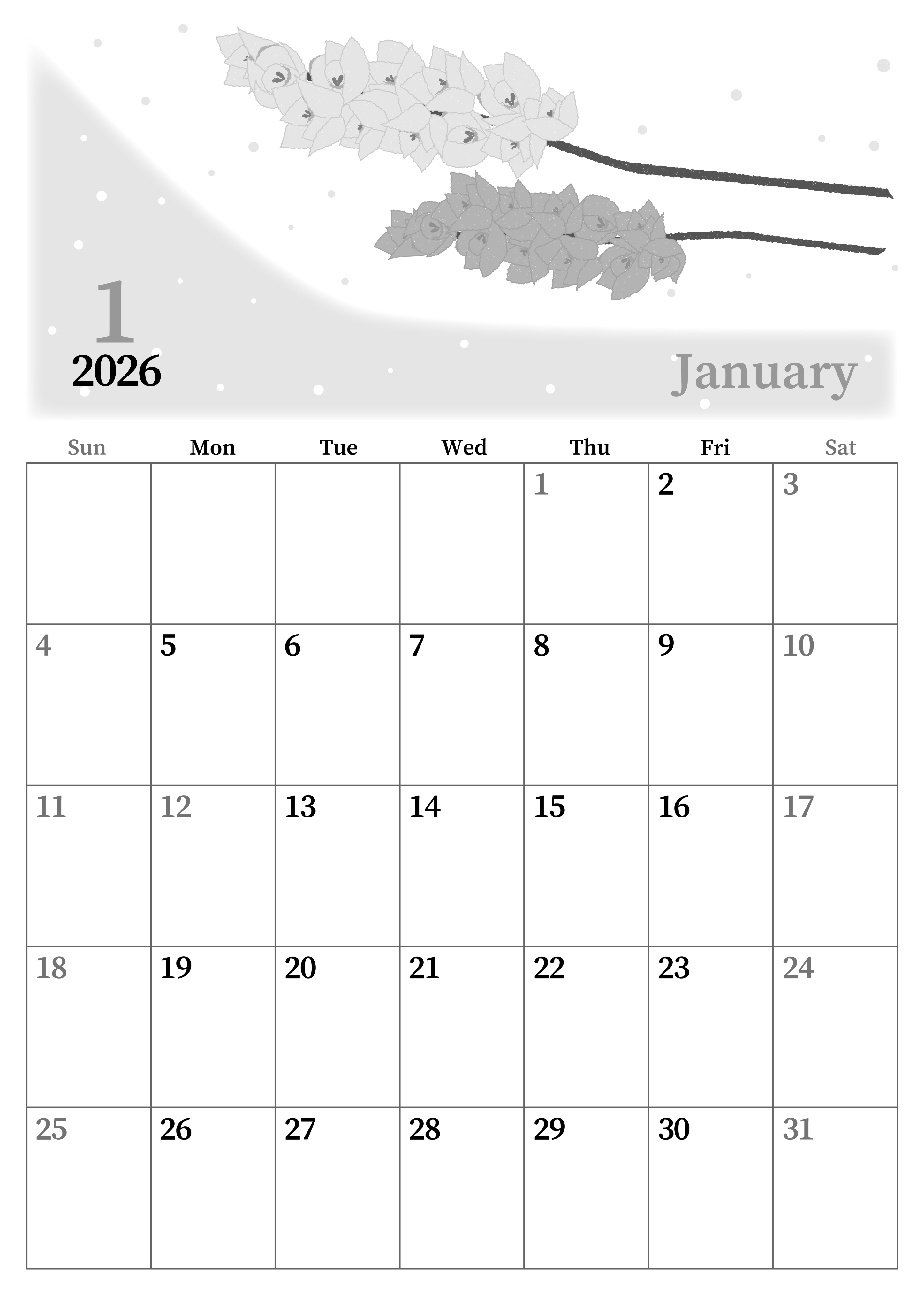 2026年1月縦型モノクロの日曜始まり白黒カレンダーです。花に癒されるという方におすすめしたい白黒カレンダーです。ガーリーでありながらもシックでおしゃれなオリジナルイラストです。罫線もくっきりと引かれているので便利です。(2026-00390110)