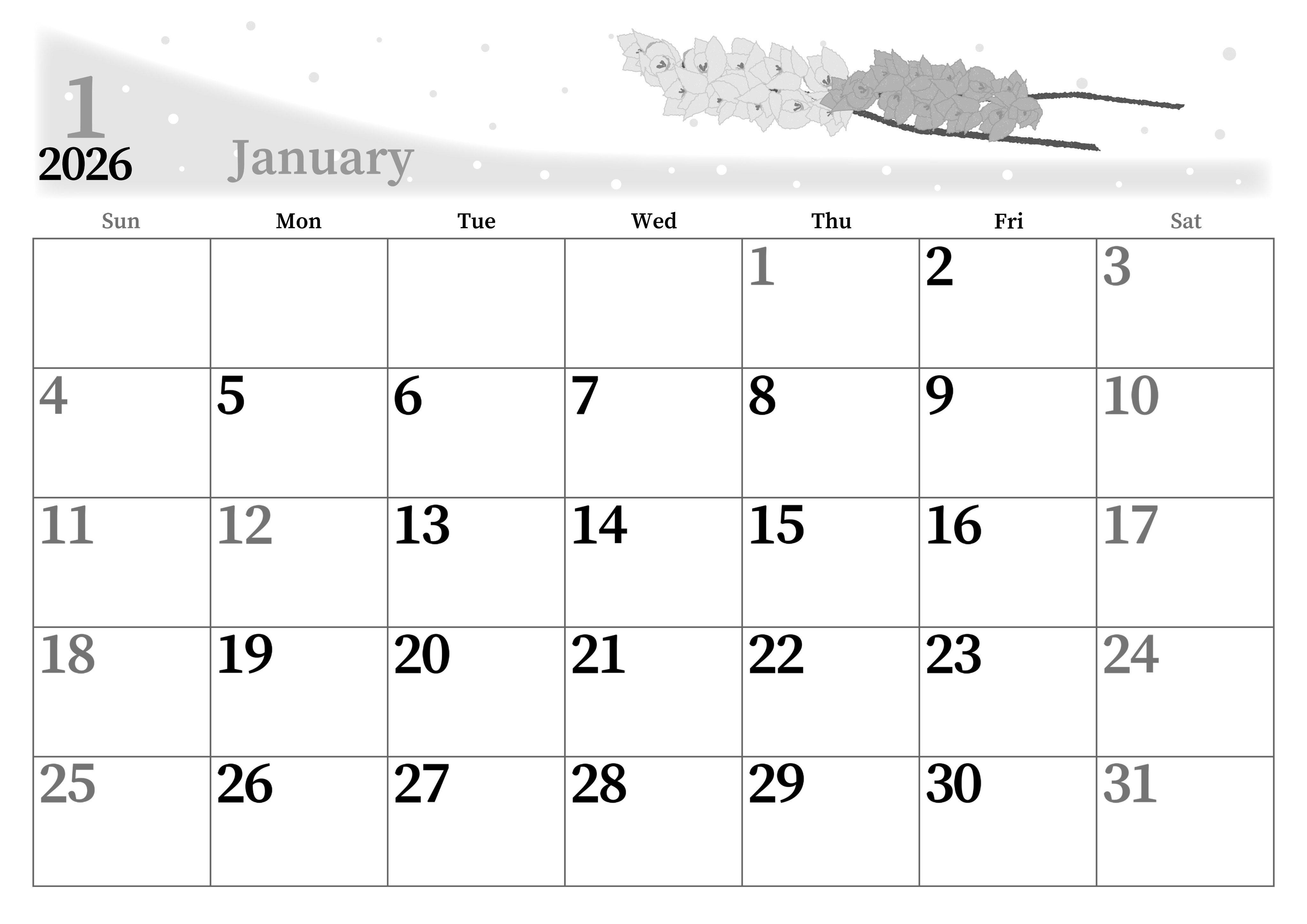 2026年1月横型モノクロの日曜始まり白黒カレンダーです。横たわるように添えられている花のイラストがおしゃれで上品なA4印刷用白黒カレンダーです。罫線が明確なのでスケジュールを書き込みしやすい素材となっています。(2026-00390100)