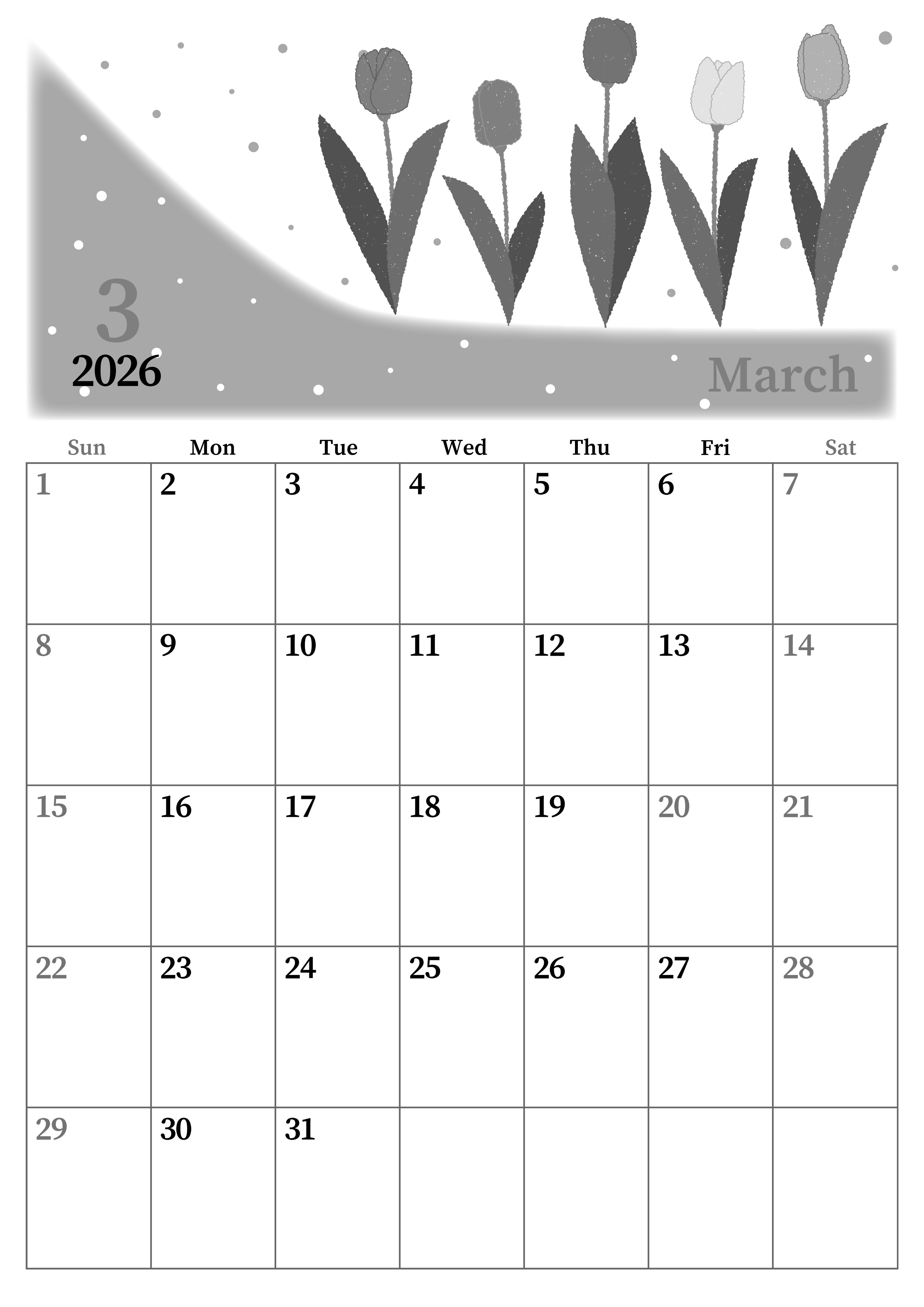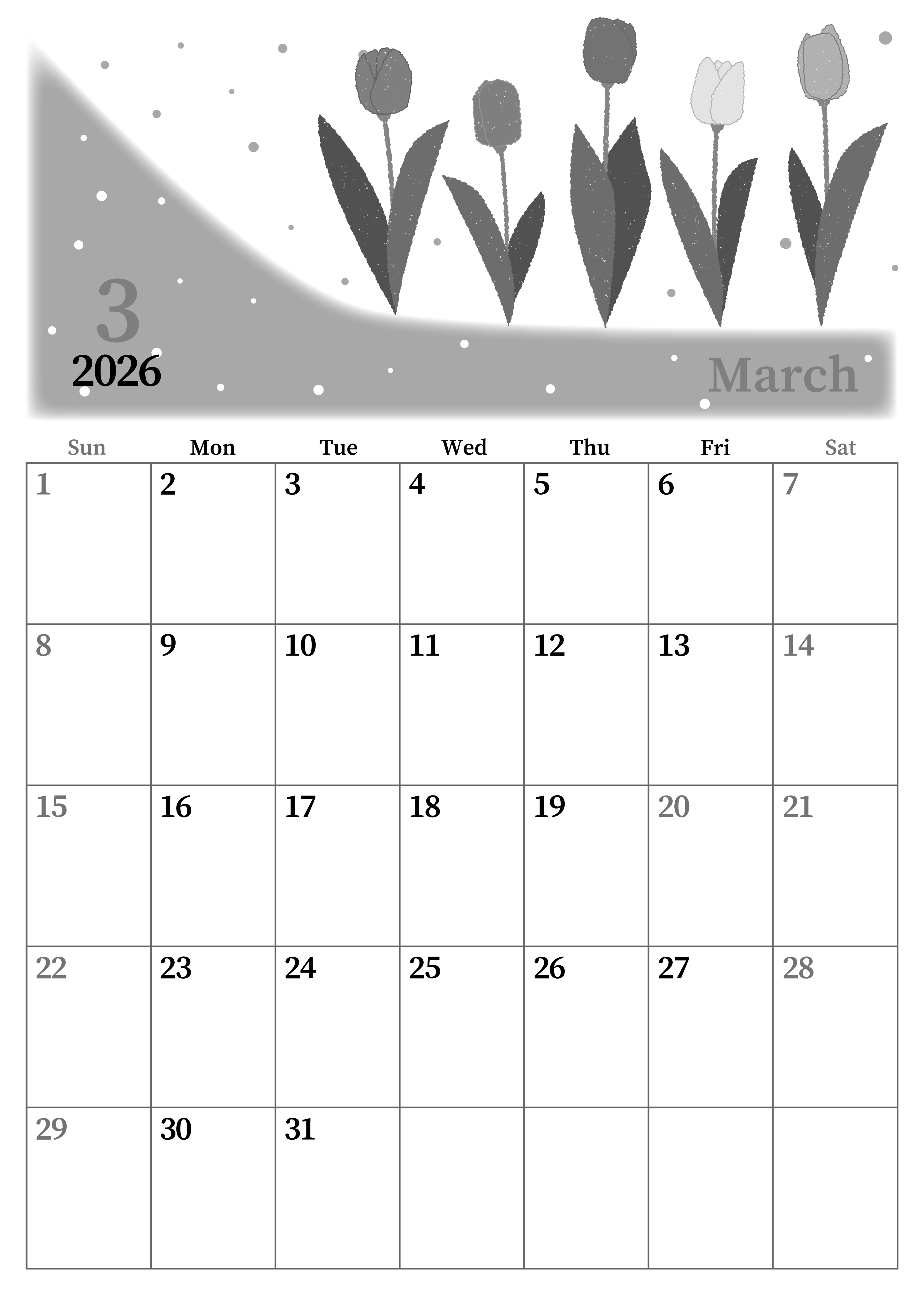 2026年3月縦型モノクロの日曜始まりの無料テンプレート白黒カレンダーです。チューリップのお洒落なイラストが春の訪れを彷彿とさせるおしゃれで使いたくなる白黒カレンダー素材は無料ダウンロードが行えるのでおすすめです。(2026-00390310)