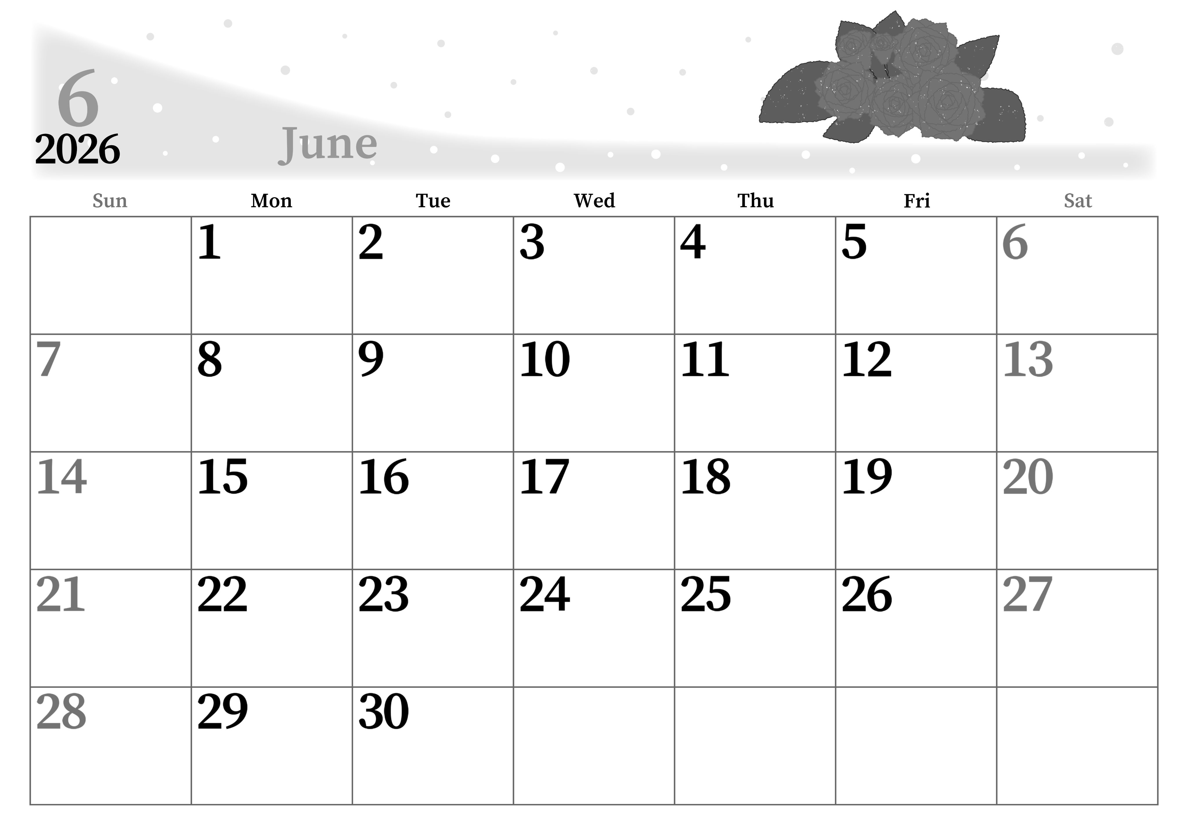 2026年6月横型モノクロの日曜始まりの無料テンプレート白黒カレンダーです。薔薇のイラストがおしゃれで大人っぽいイラストの白黒カレンダーです。曜日によって文字の色分けが成されているので見やすいフリー素材といえます。(2026-00390600)