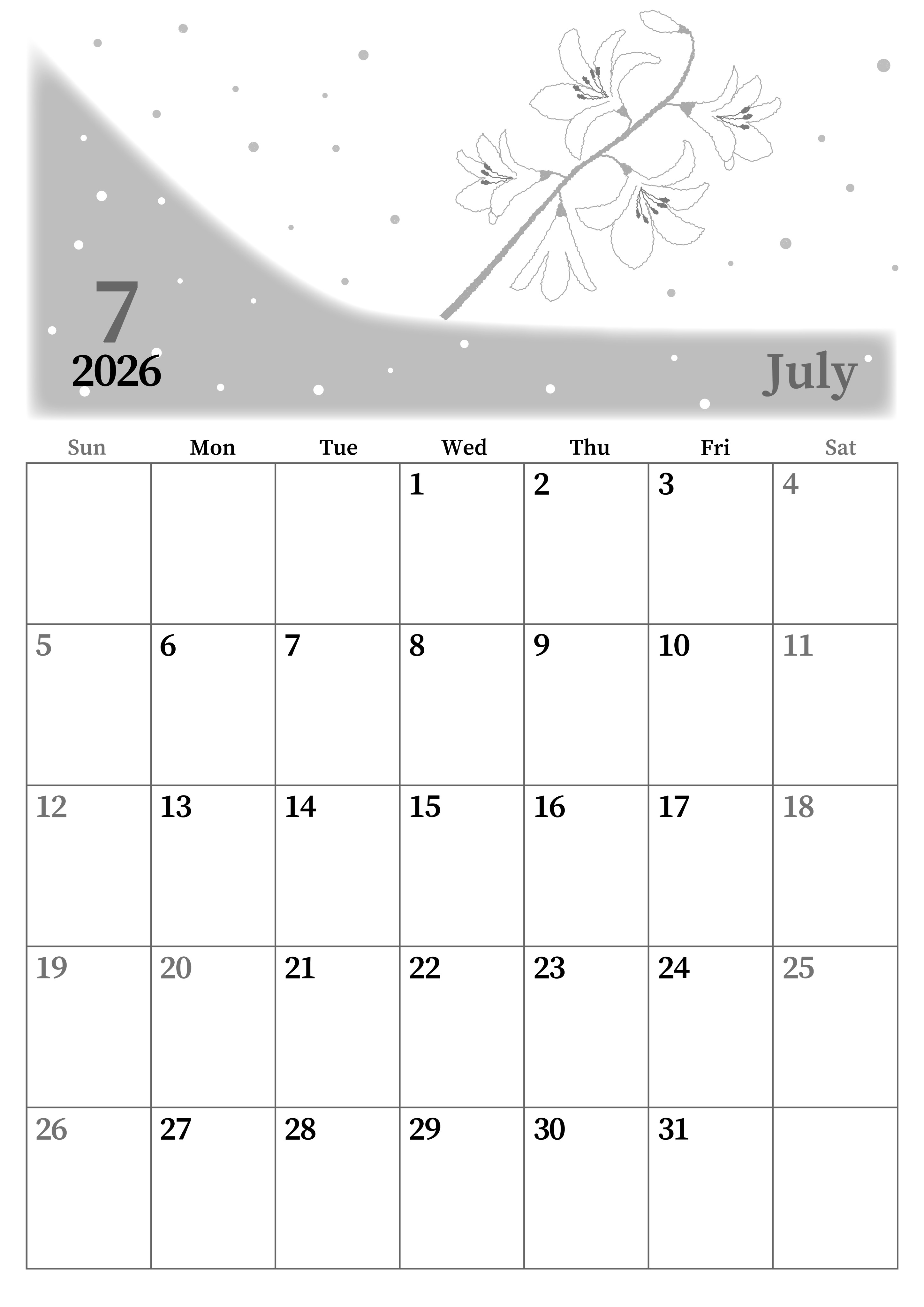 2026年7月縦型モノクロの日曜始まり 白ユリのイラストがおしゃれなA4無料白黒カレンダー(2026-00390710)