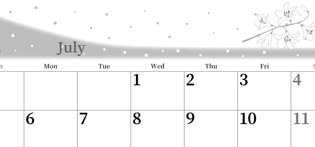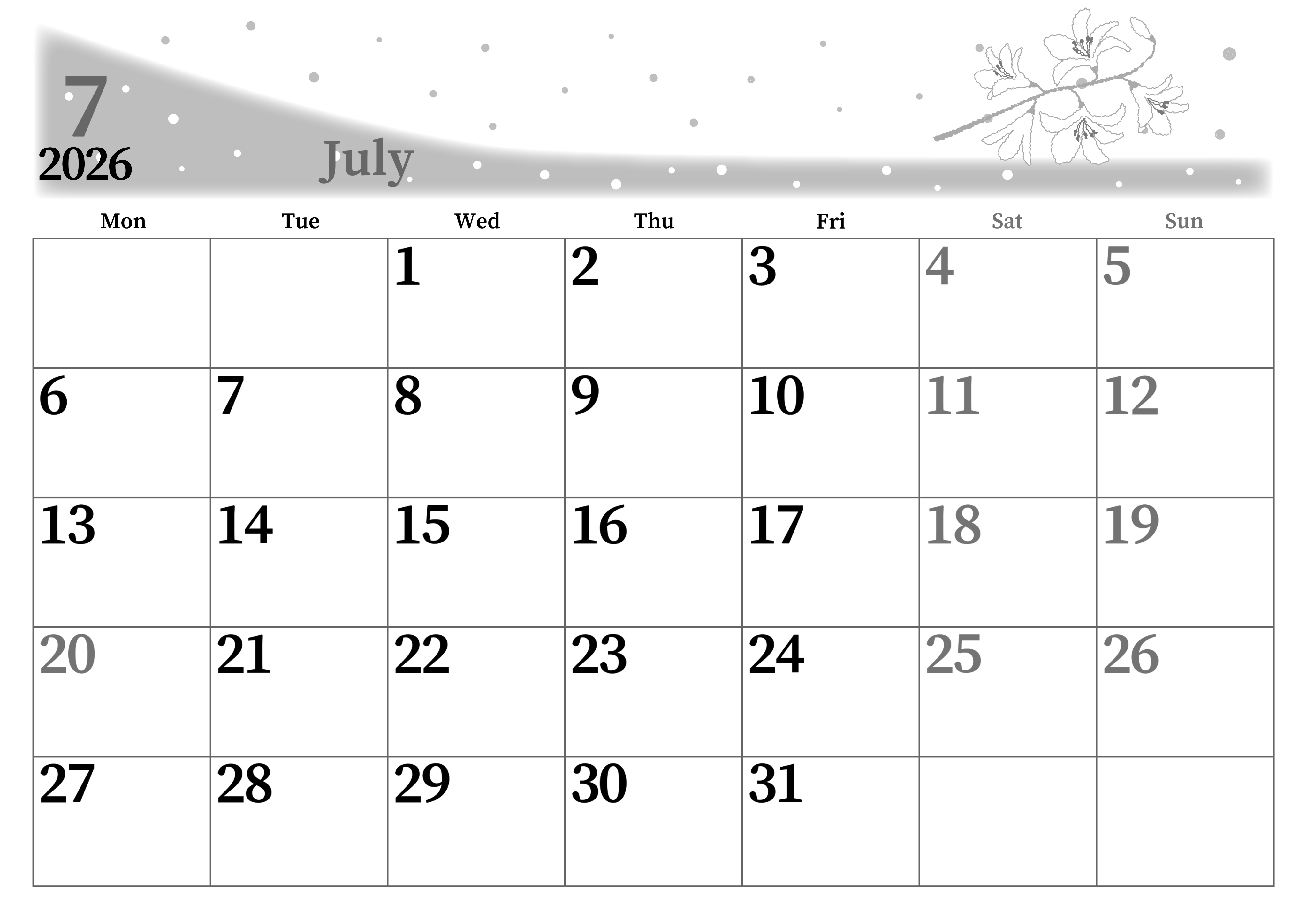 2026年7月横型モノクロの月曜始まりの無料テンプレート白黒カレンダーです。月曜始まりなだけでなく予定を記入するエリアが広いので実用性が極めて高い白黒カレンダーです。白ユリのイラストもおしゃれでスタイリッシュです。(2026-00390701)