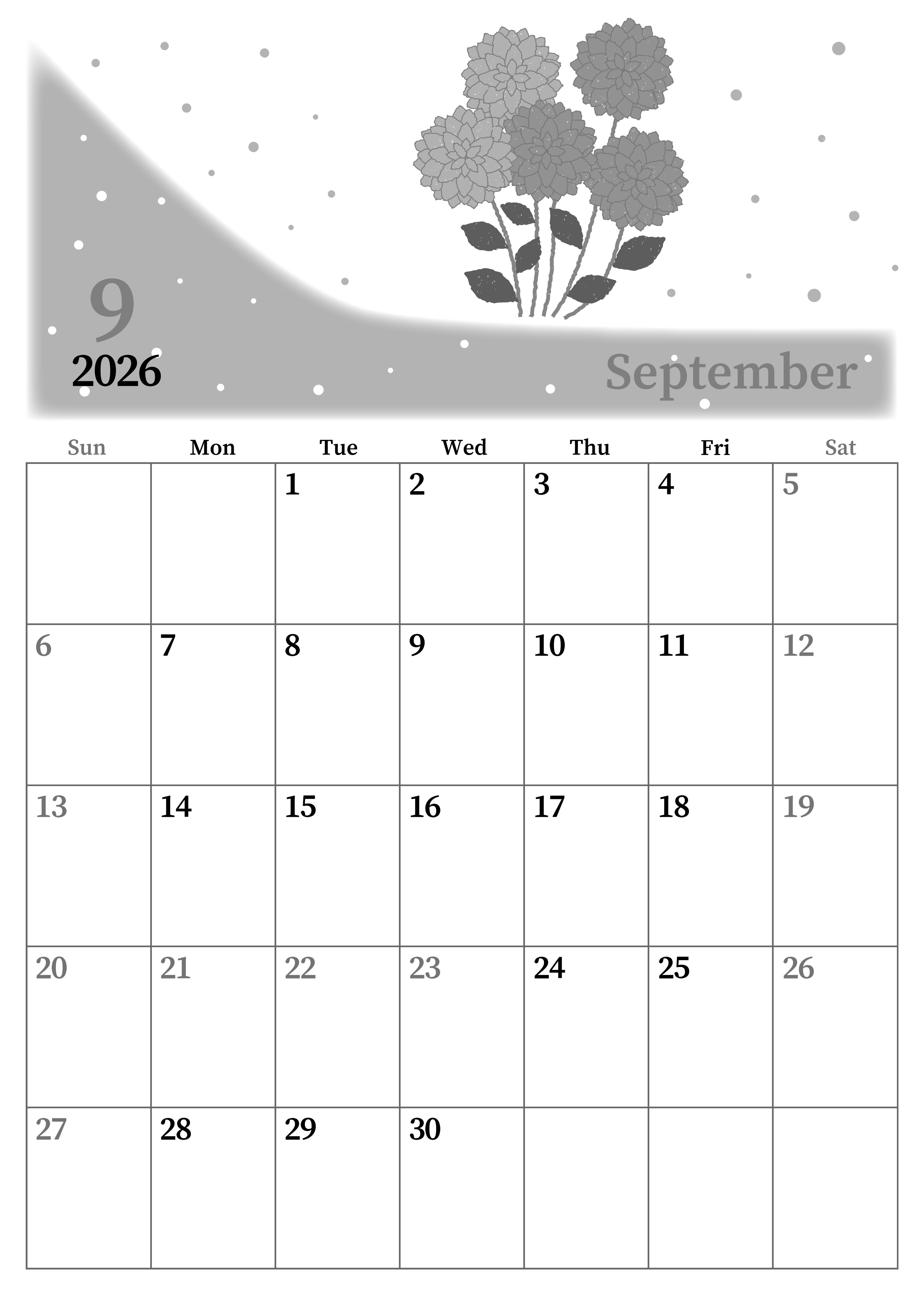 2026年9月縦型モノクロの日曜始まり マリーゴールドがおしゃれなイラストA4無料白黒カレンダー(2026-00390910)