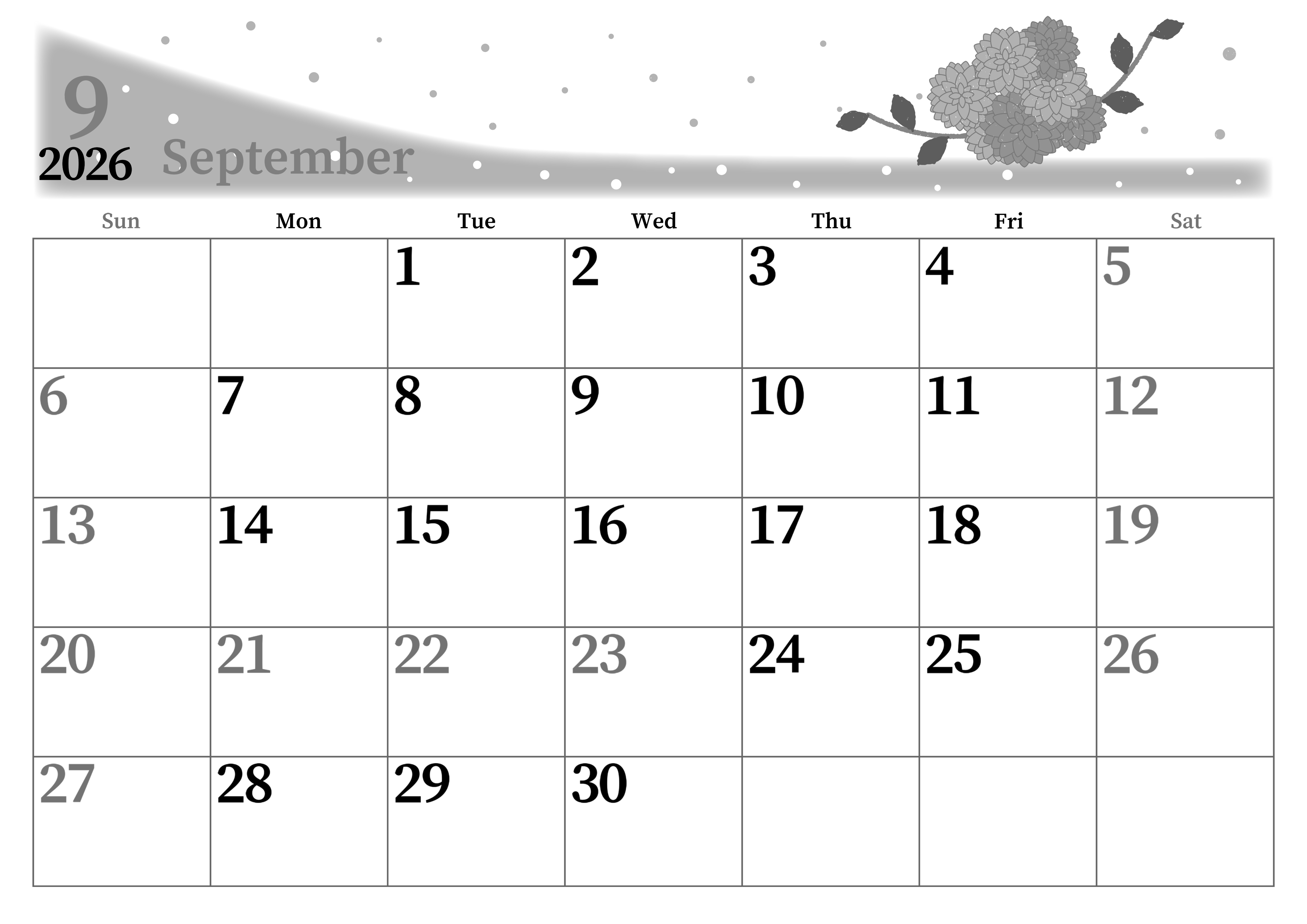 2026年9月横型モノクロの日曜始まりの無料テンプレート白黒カレンダーです。マリーゴールドのイラストがワンポイントでインクの使用量が少なめのエコなフリー素材です。おしゃれな雰囲気なだけでなく罫線もくっきりしているので見やすいです。(2026-00390900)