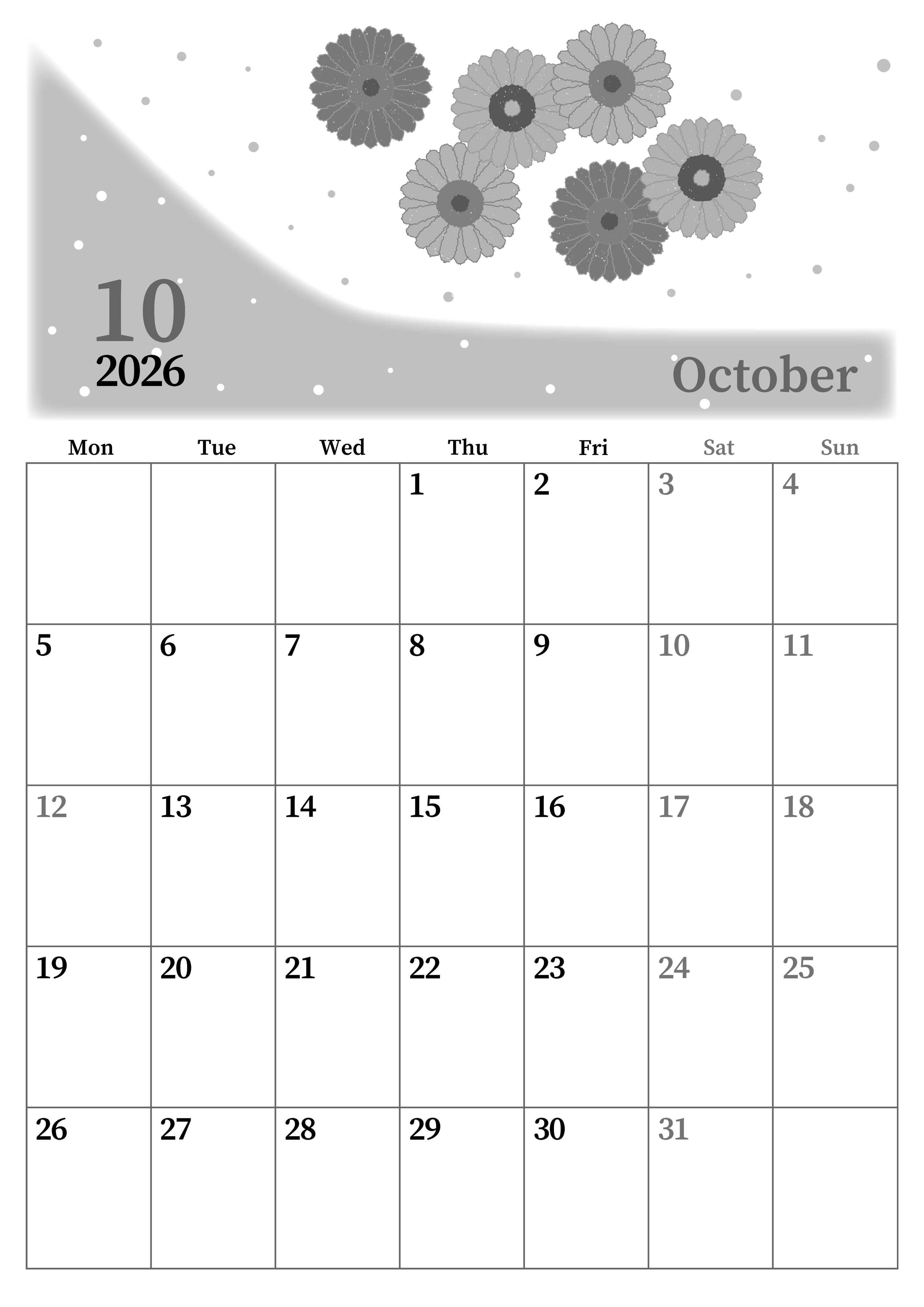 2026年10月縦型モノクロの月曜始まり ダリアの花イラストのおしゃれA4無料白黒カレンダー(2026-00391011)