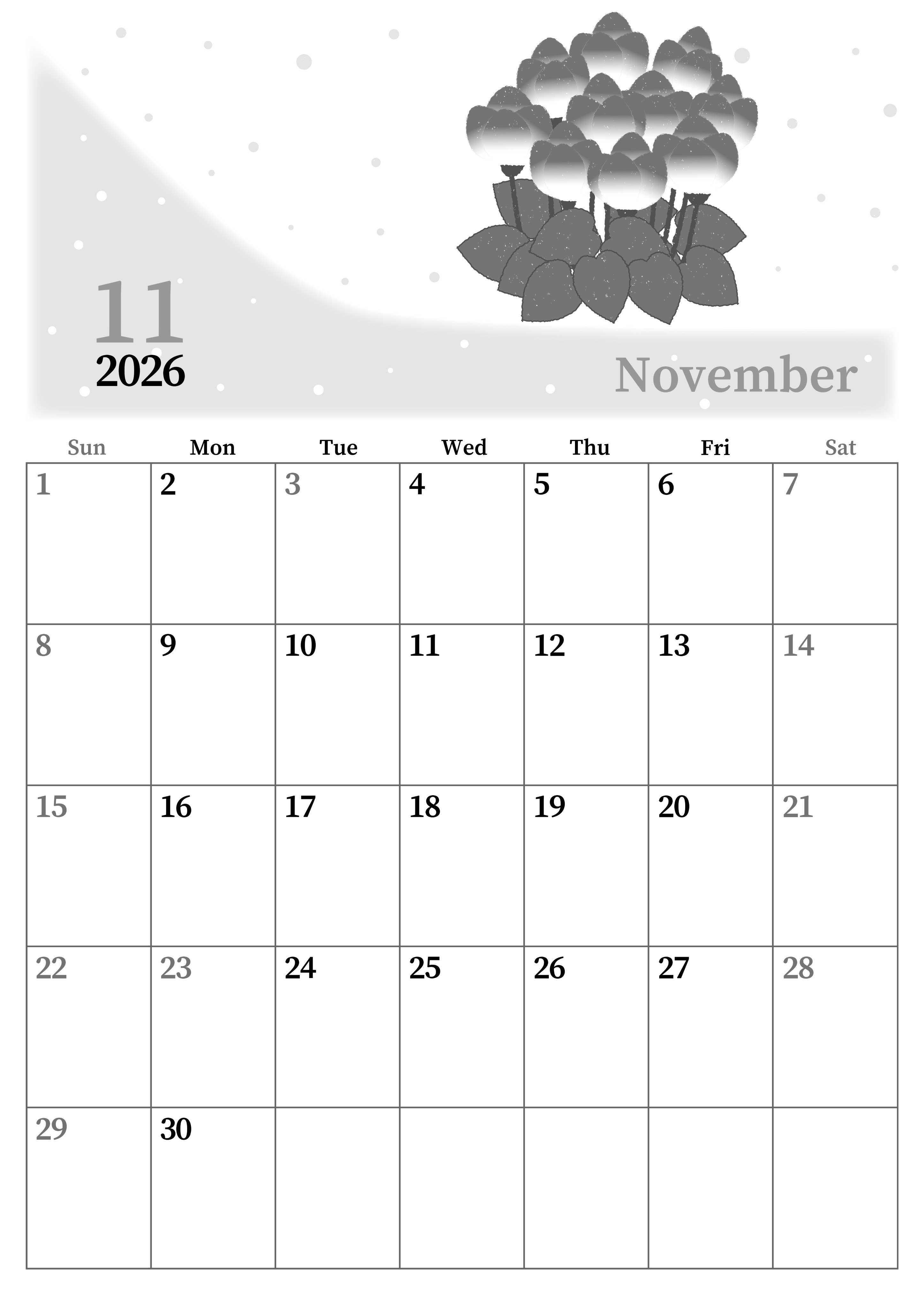 2026年11月縦型モノクロの日曜始まり シクラメンがおしゃれなイラストA4無料白黒カレンダー(2026-00391110)