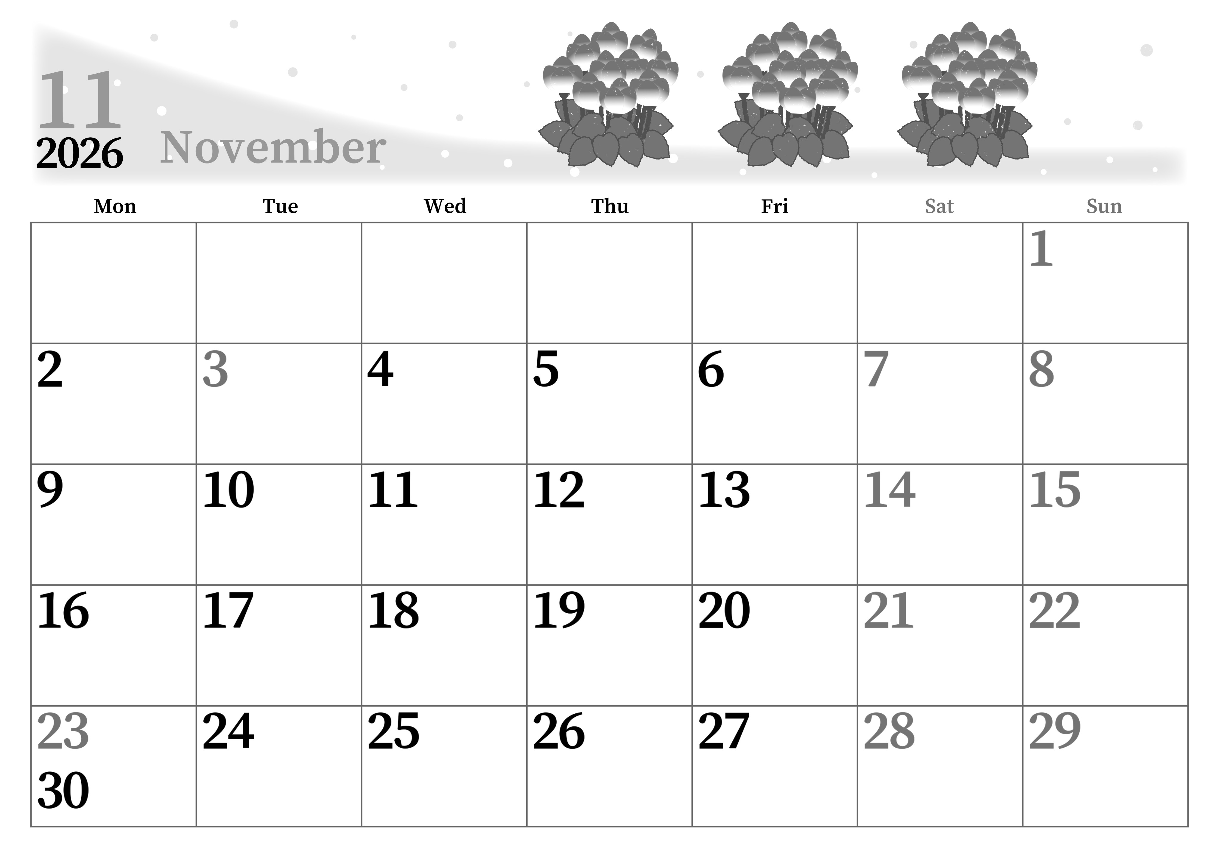 2026年11月横型モノクロの月曜始まりの無料テンプレート白黒カレンダーです。月曜始まりなので仕事や勉強のプランニングがしやすいレイアウトです。シクラメンのイラストが大人おしゃれなので使うのが楽しくなります。(2026-00391101)