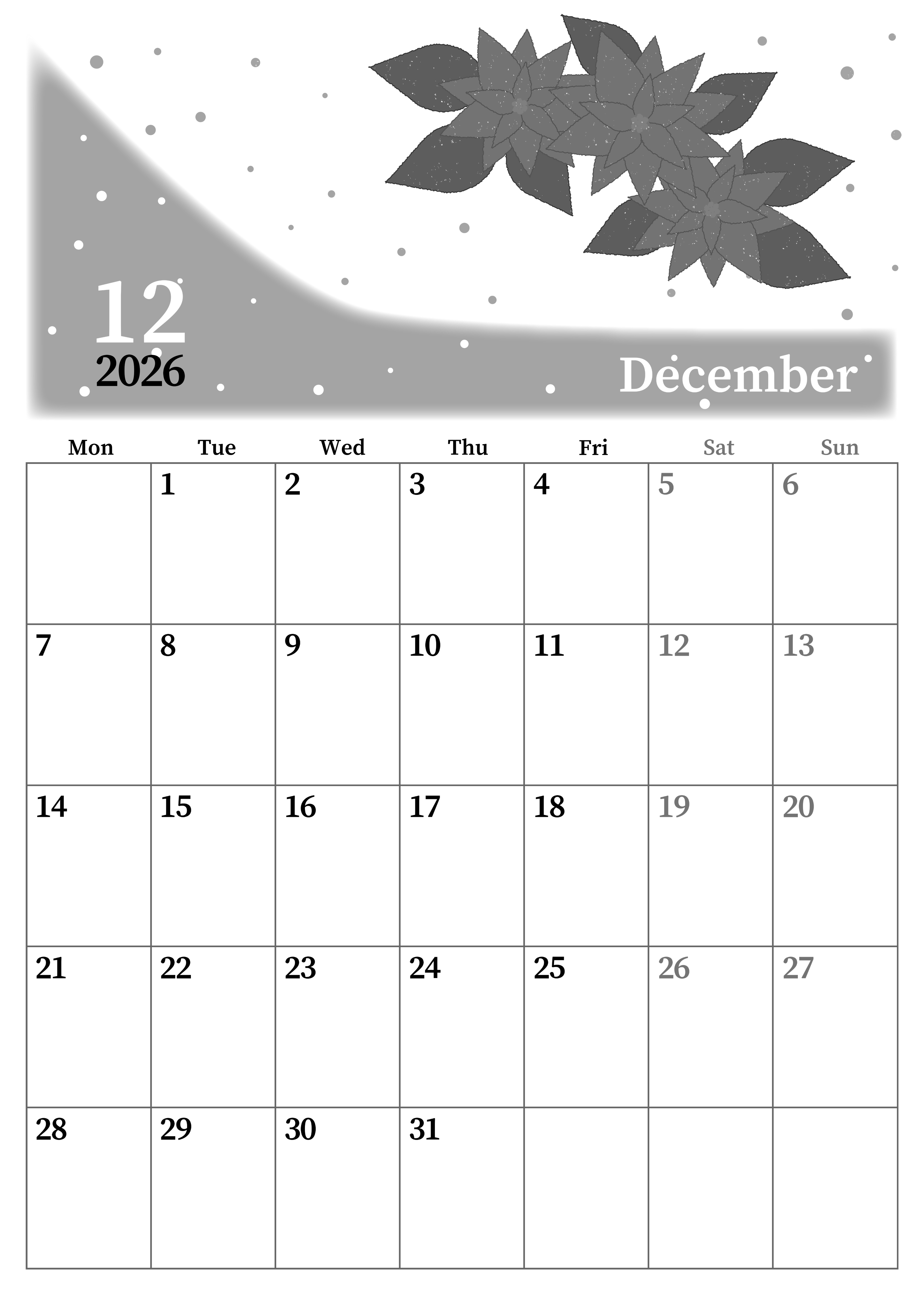 2026年12月縦型モノクロの月曜始まりの無料テンプレート白黒カレンダーです。赤々としたポインセチアが集まって咲き誇っている様子を描いたイラストがクリスマスの雰囲気を醸し出していてとてもおしゃれです。(2026-00391211)