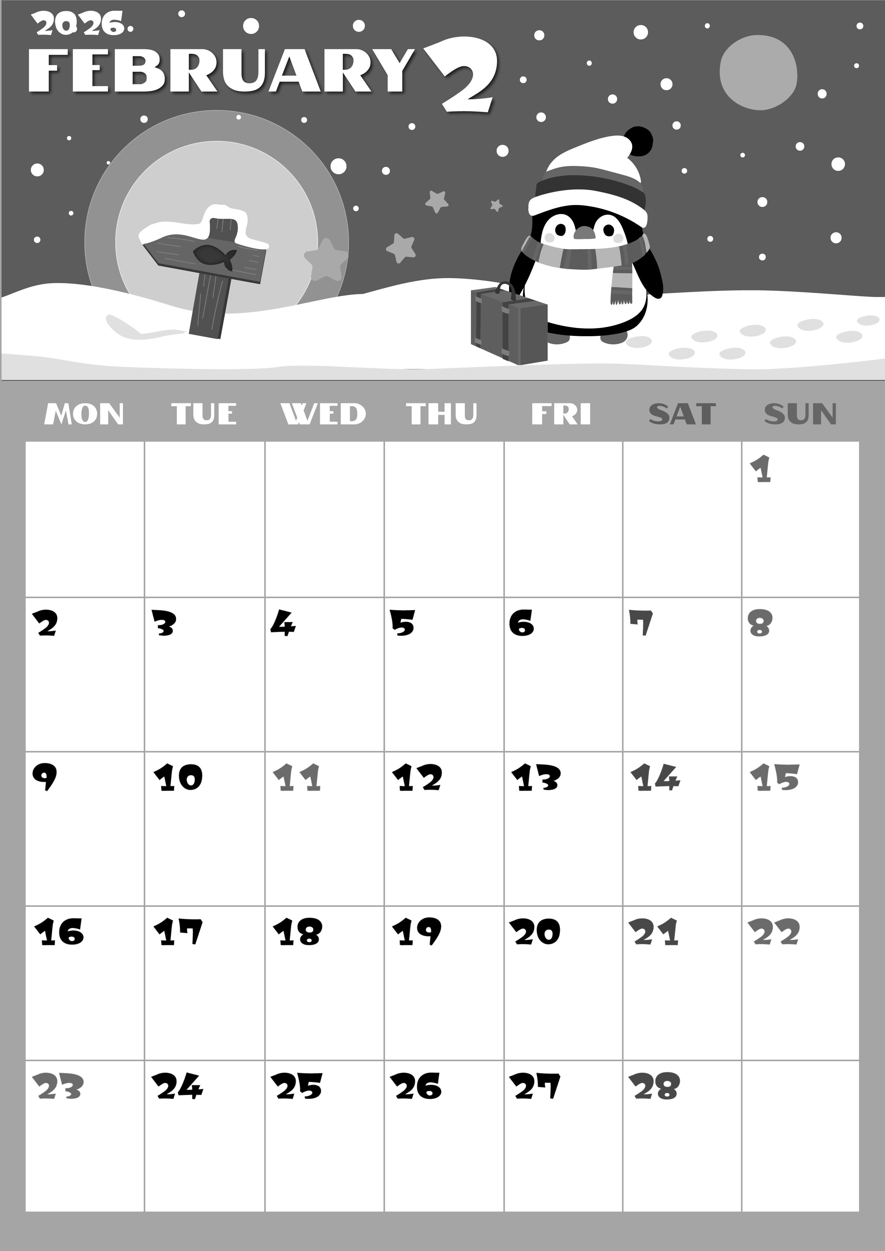 2026年2月縦型モノクロの月曜始まり白黒カレンダーです。つぶらな瞳でこちらを見つめるペンギンのイラストがかわいい癒し効果の高いポップ調の白黒カレンダーです。月曜始まりの白黒カレンダーを探している人におすすめのフリー素材です。(2026-00400211)