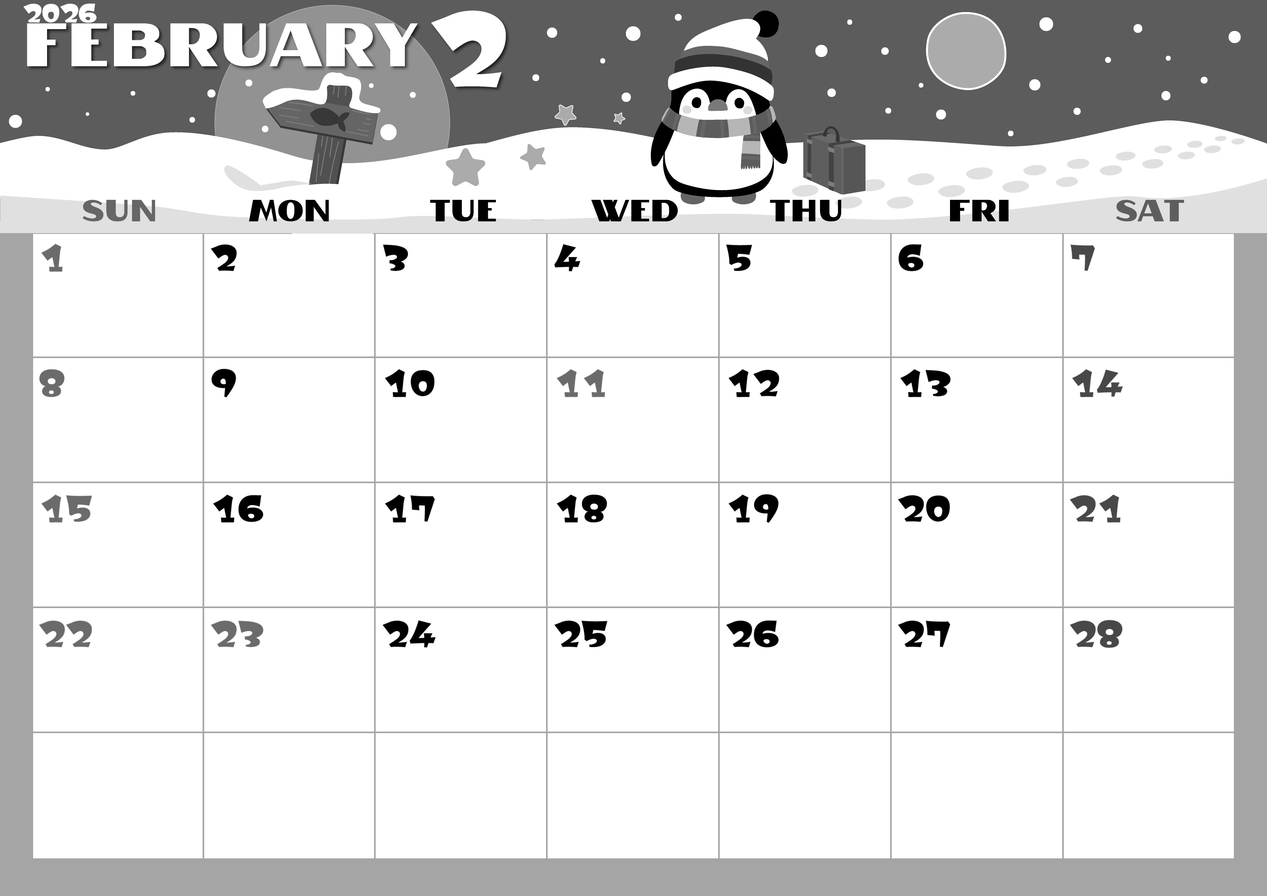 2026年2月横型モノクロの日曜始まり白黒カレンダーです。ペンギンがマフラーやウールの帽子で完全防寒対策をしているかわいいイラストです。白黒カレンダーに使われている文字はポップで飛び出してきそうです。(2026-00400200)