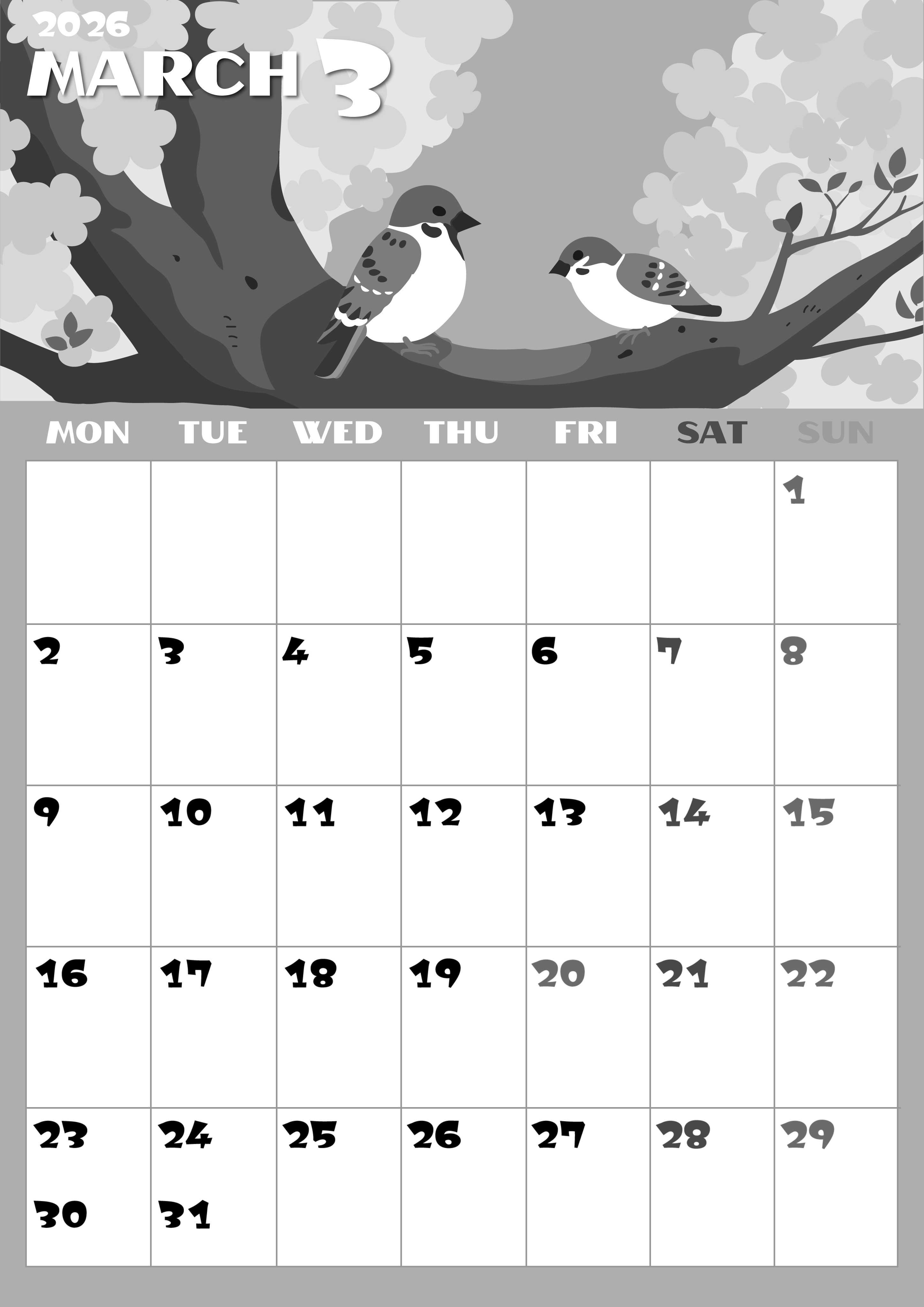 2026年3月縦型モノクロの月曜始まりの無料テンプレート白黒カレンダーです。月曜始まりのレイアウトで桜と雀のイラストがかわいい春爛漫な無料白黒カレンダーです。罫線があるのでスケジュールが見やすいデザインとなっています。(2026-00400311)