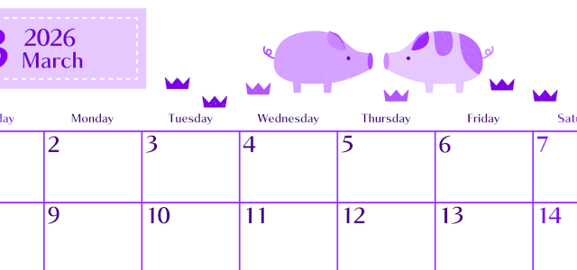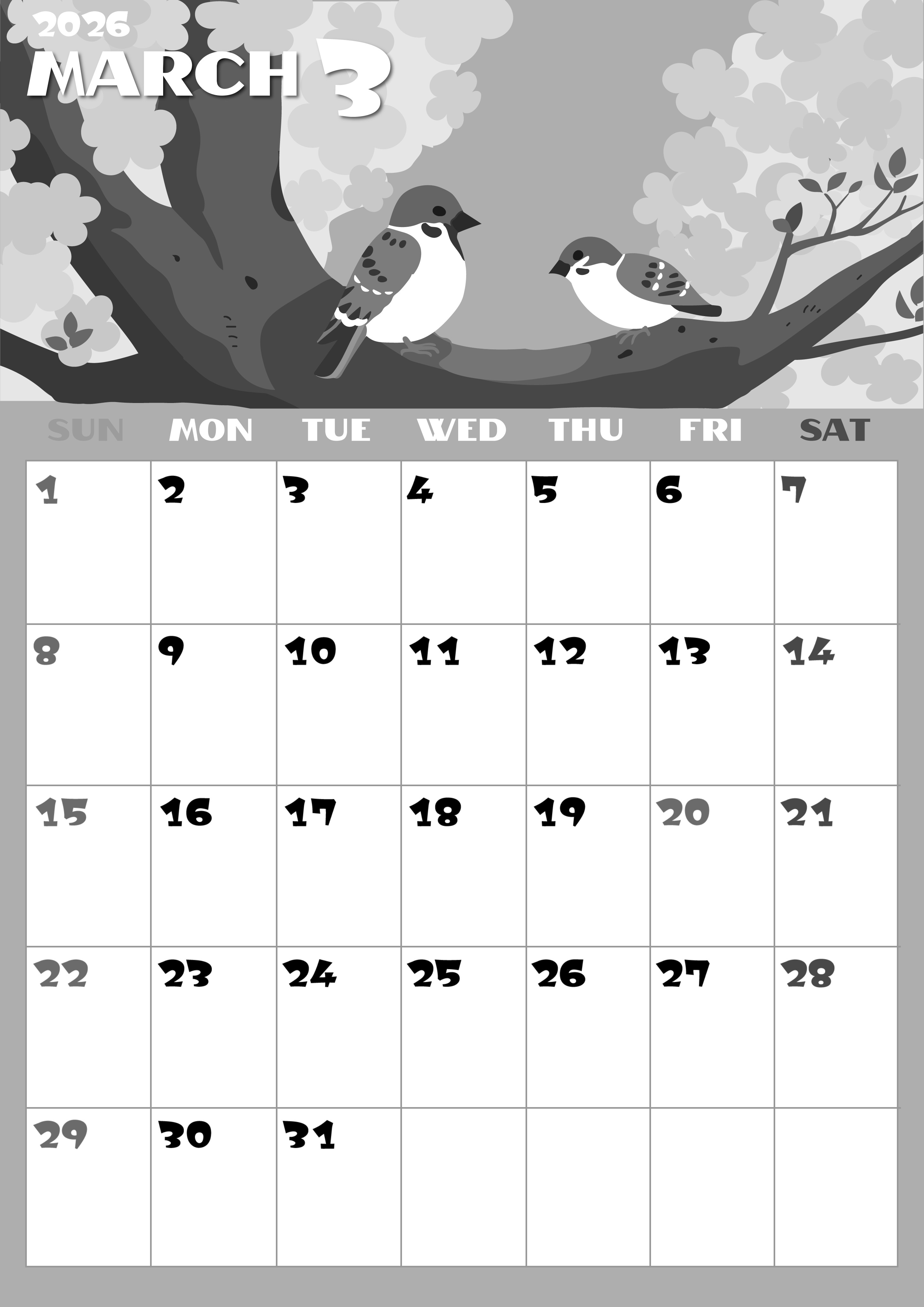 2026年3月縦型モノクロの日曜始まりの無料テンプレート白黒カレンダーです。桜の木にちょこんととまっているいる雀のつがいがかわいいhるを感じさせる白黒カレンダーフリー素材です。曜日で色分けされているので見やすいです。(2026-00400310)