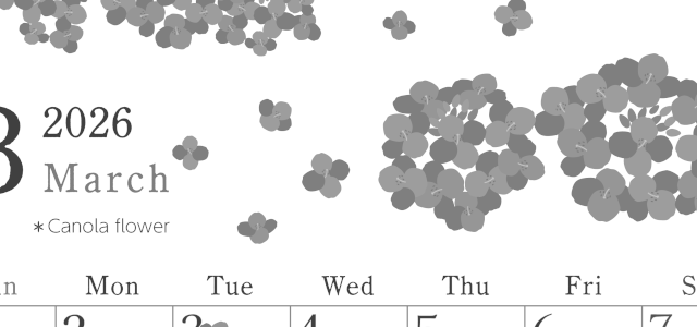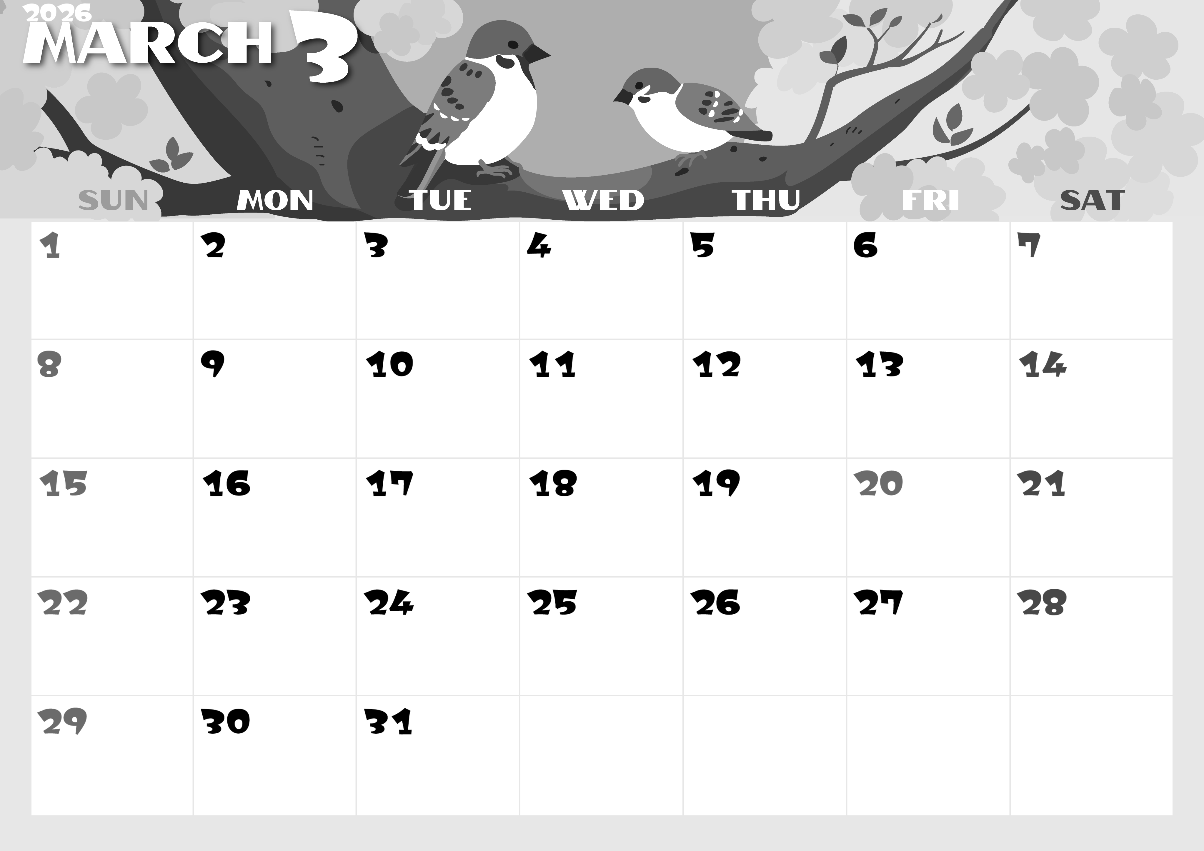 2026年3月横型モノクロの日曜始まりの無料テンプレート白黒カレンダーです。桜の花に囲まれた雀のカップルのイラストがかわいい白黒カレンダーテンプレートです。横向きなのでたくさんの予定を書き込みできるフォーマットとなっています。(2026-00400300)