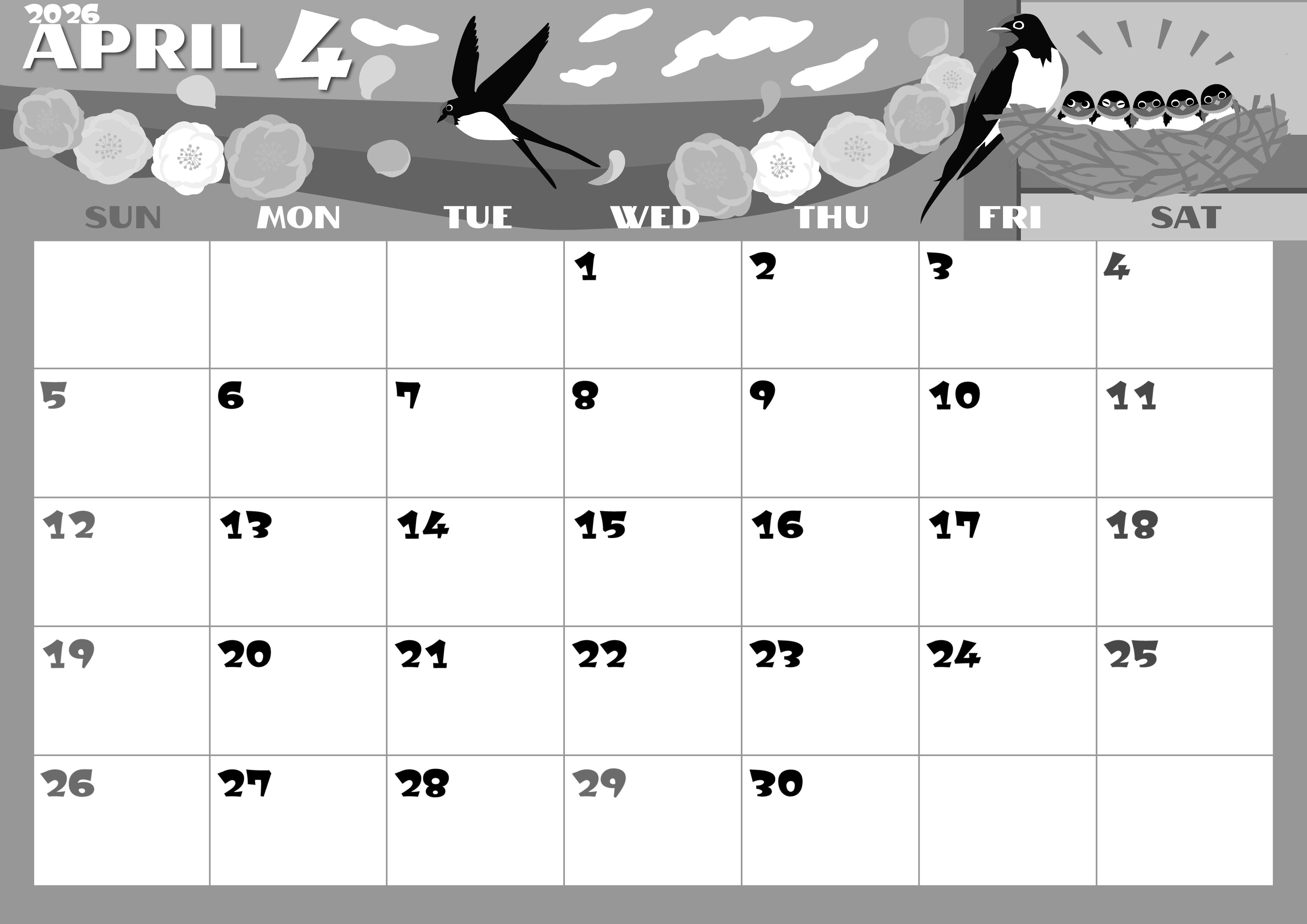 2026年4月横型モノクロの日曜始まりの無料テンプレート白黒カレンダーです。ツバメのつがいが一生懸命に子育てをしている様子が描かれている心が温まるようなかわいいイラスト白黒カレンダーです。ご家族での利用をおすすめします。(2026-00400400)