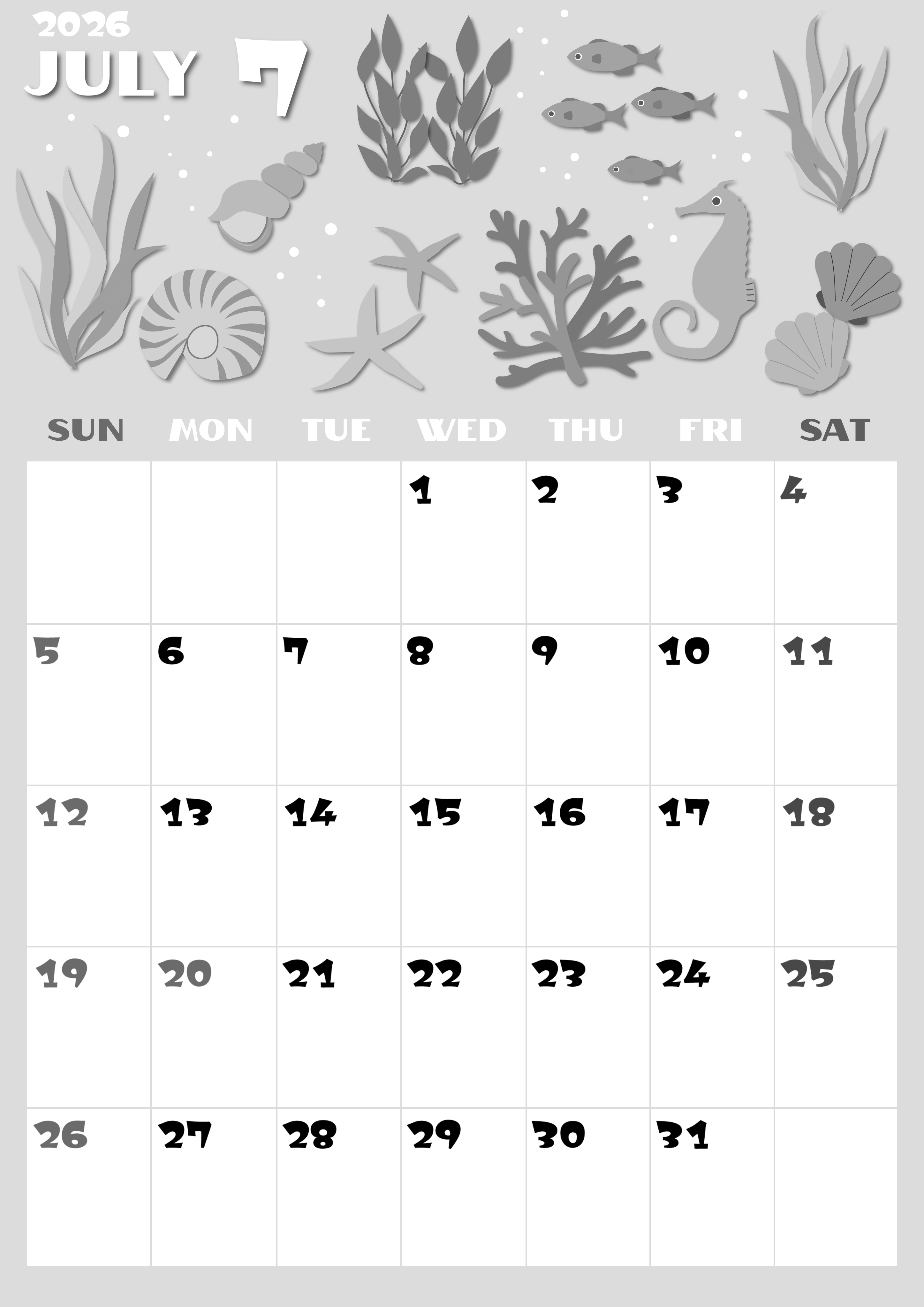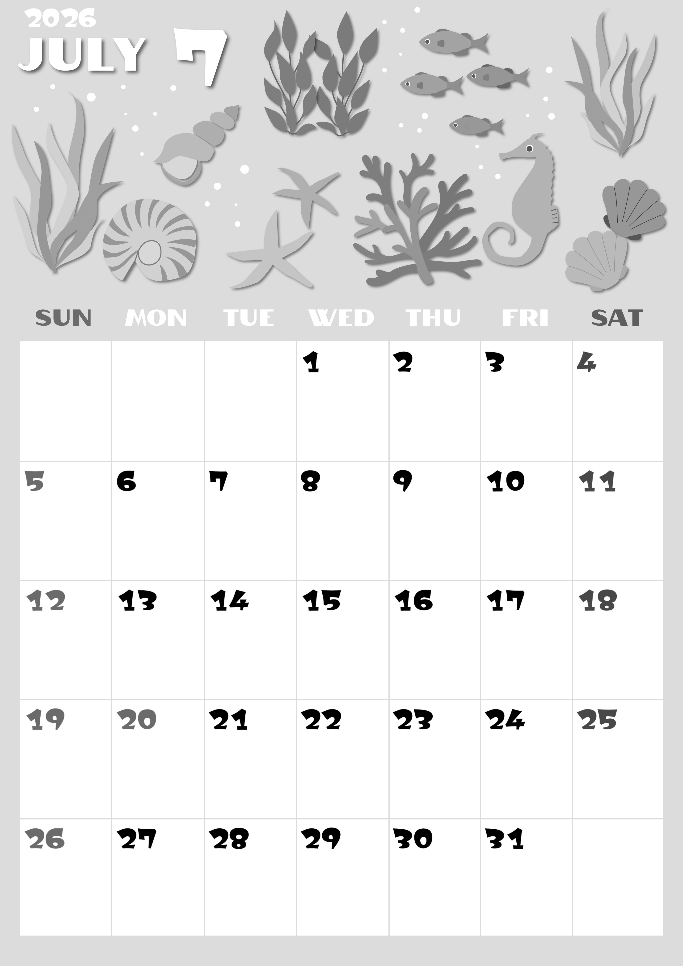 2026年・無料のカレンダーテンプレート 2026年7月縦型モノクロの日曜始まり 海の生き物イラストがかわいいA4無料白黒カレンダー(2026-00400710) 素材状デザイン王 2025年4月1日 2026年7月縦型モノクロの日曜始まりの無料テンプレート白黒カレンダーです。温かみのある個性的な海の生き物が並ぶように描かれたかわいいイラスト白黒カレンダーとなっています。(2026-00400710) 7月 縦型のカレンダー 日曜始まり 白黒 カレンダーデザイン-0040