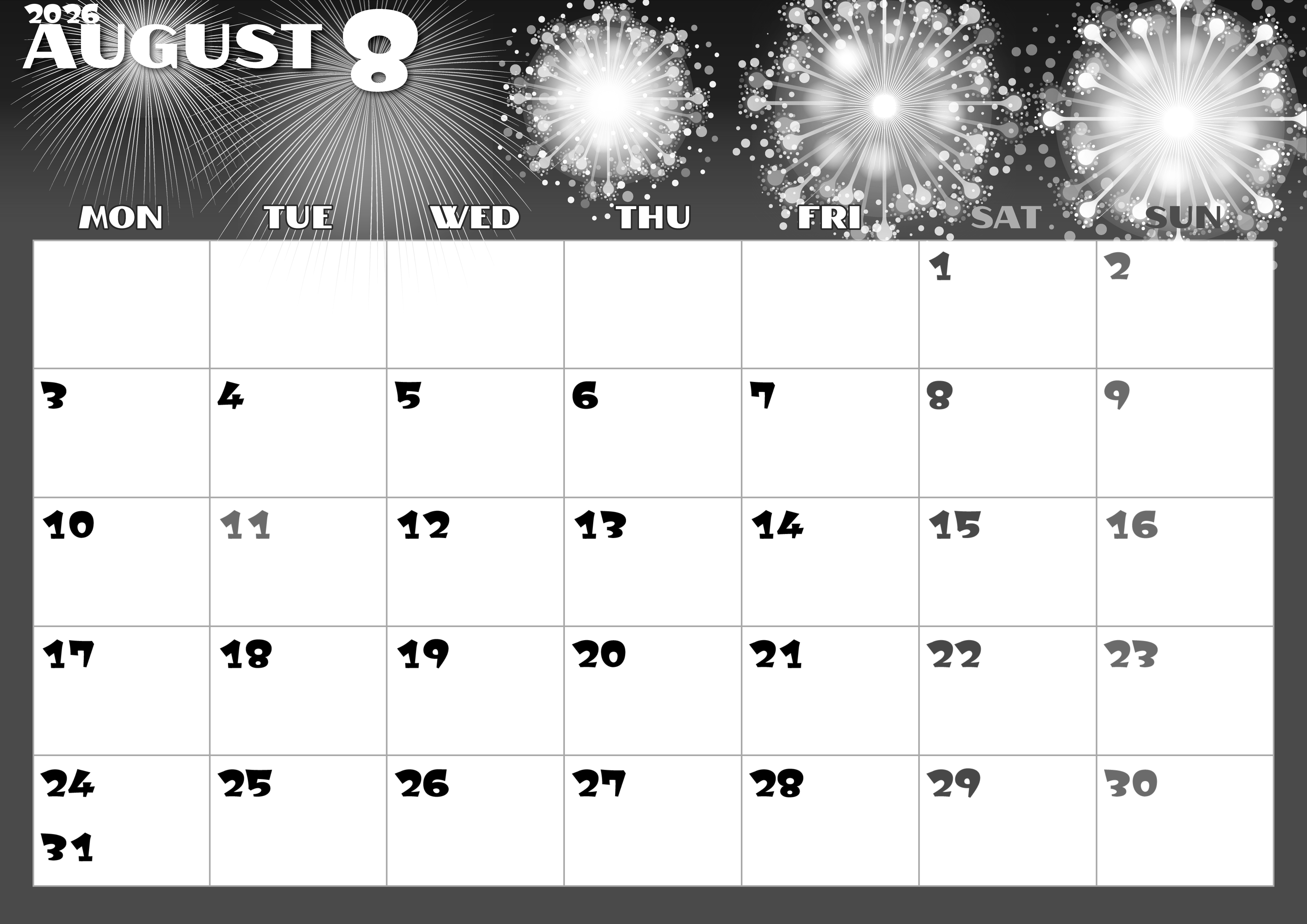 2026年8月横型モノクロの月曜始まりの無料テンプレート白黒カレンダーです。季節の風物詩である打ち上げ花火がまぶしいようにも見えるかわいいイラスト白黒カレンダーは月曜始まりで罫線も引いてあるので使いやすいです。(2026-00400801)