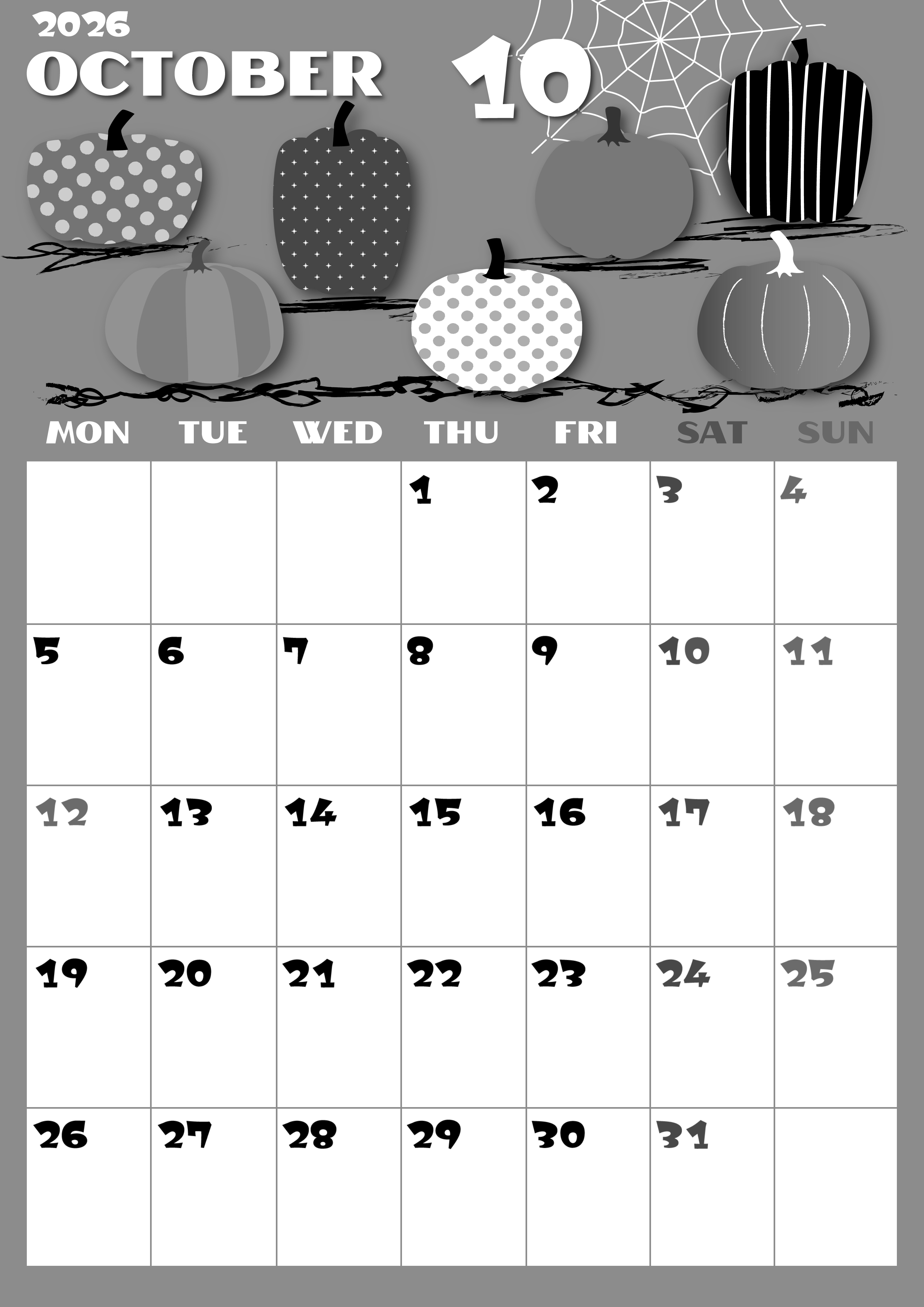 2026年10月縦型モノクロの月曜始まり パンプキンがかわいいイラストA4無料白黒カレンダー(2026-00401011)