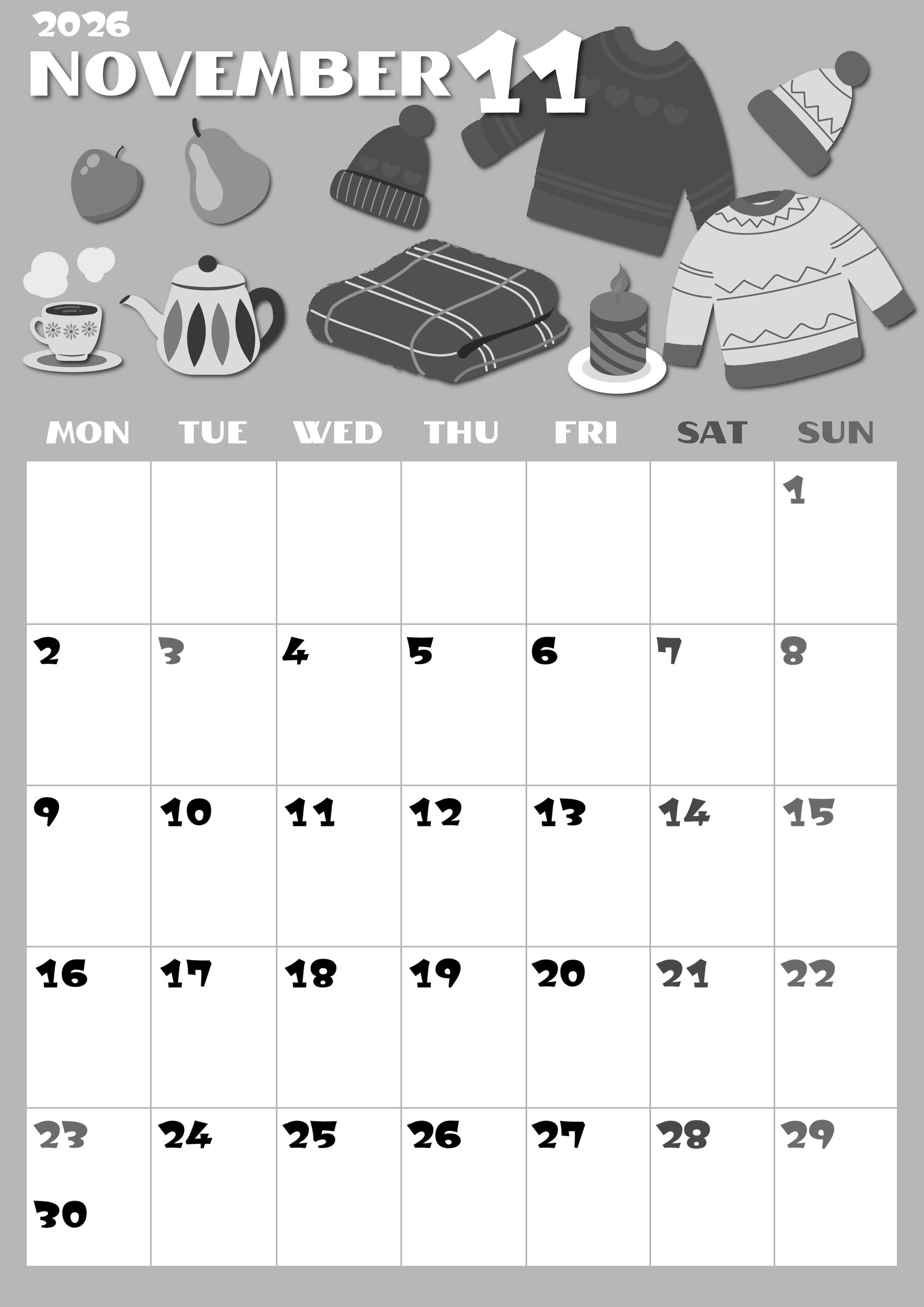 2026年・無料のカレンダーテンプレート 2026年11月縦型モノクロの月曜始まり セーターがかわいいイラストA4無料白黒カレンダー(2026-00401111) 素材状デザイン王 2025年4月1日 2026年11月縦型モノクロの月曜始まりの無料テンプレート白黒カレンダーです。セーターのイラストに温かみを感じるかわいいテイストです。縦向きなので張り付けていつでもチェックできるように使えます。(2026-00401111) 11月 縦型のカレンダー 月曜始まり 白黒 カレンダーデザイン-0040