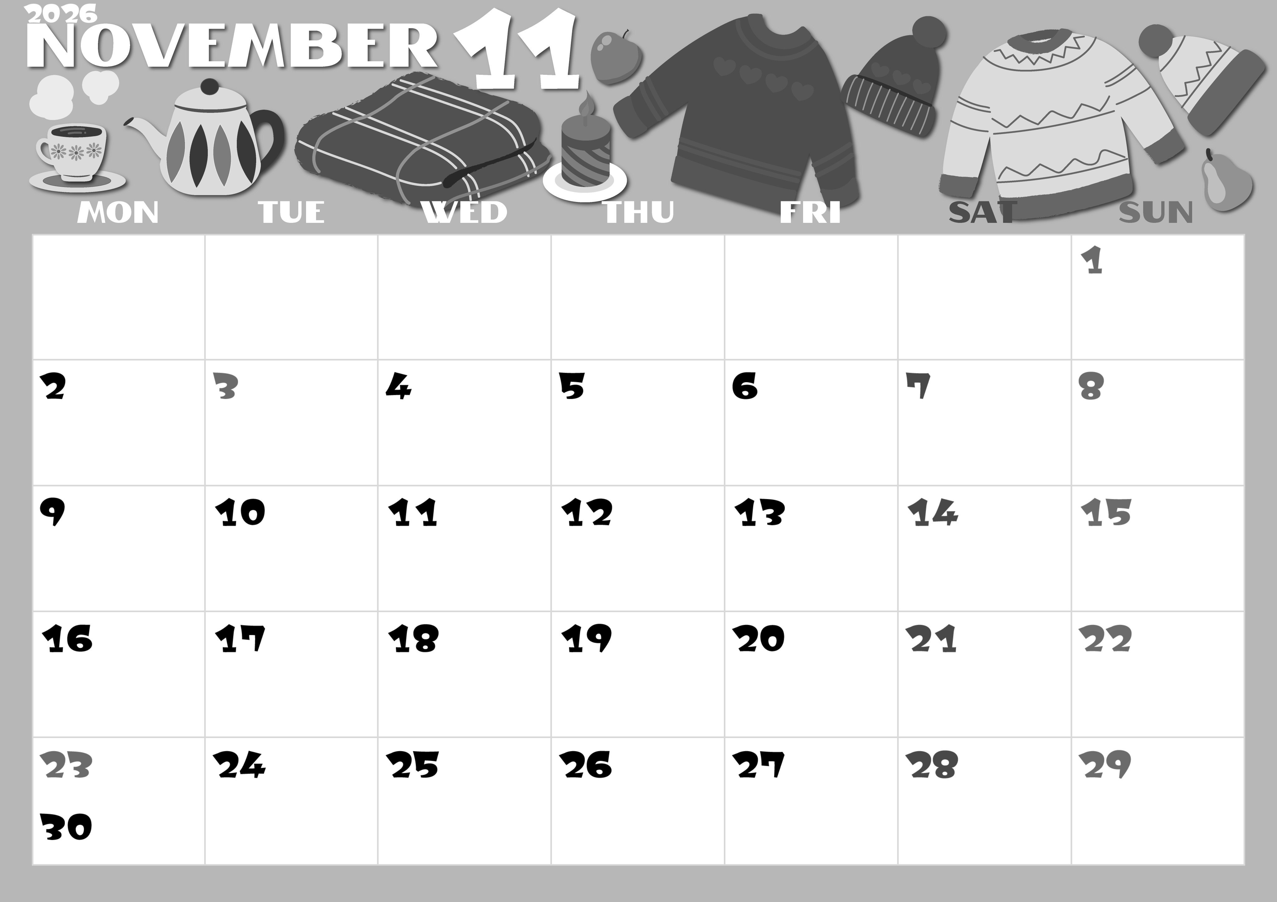 2026年・無料のカレンダーテンプレート 2026年11月横型モノクロの月曜始まり セーターがかわいいイラストA4無料白黒カレンダー(2026-00401101) 素材状デザイン王 2025年4月1日 2026年11月横型モノクロの月曜始まりの無料テンプレート白黒カレンダーです。セーターや紅茶のイラストが落ち着いていて大人かわいいデザインのイラストに仕上がっています。月曜始まりでとても便利です。(2026-00401101) 11月 横型のカレンダー 月曜始まり 白黒 カレンダーデザイン-0040
