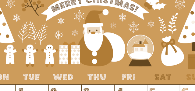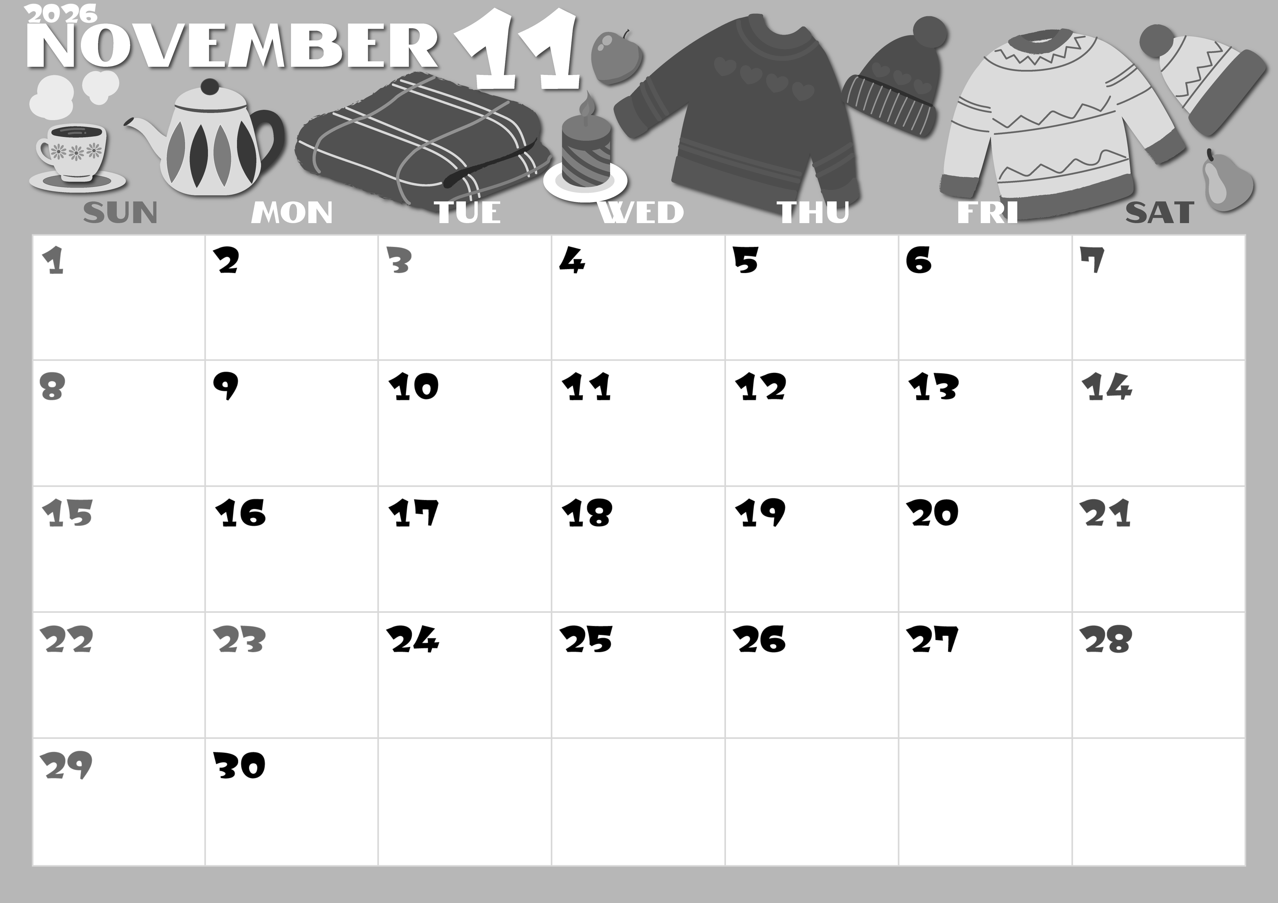2026年11月横型モノクロの日曜始まりの無料テンプレート白黒カレンダーです。セーターやマフラーといったぬくぬく暖かそうな衣料品がたっぷり描かれているかわいいイラストがしきつめられている横向きの白黒カレンダーです。(2026-00401100)