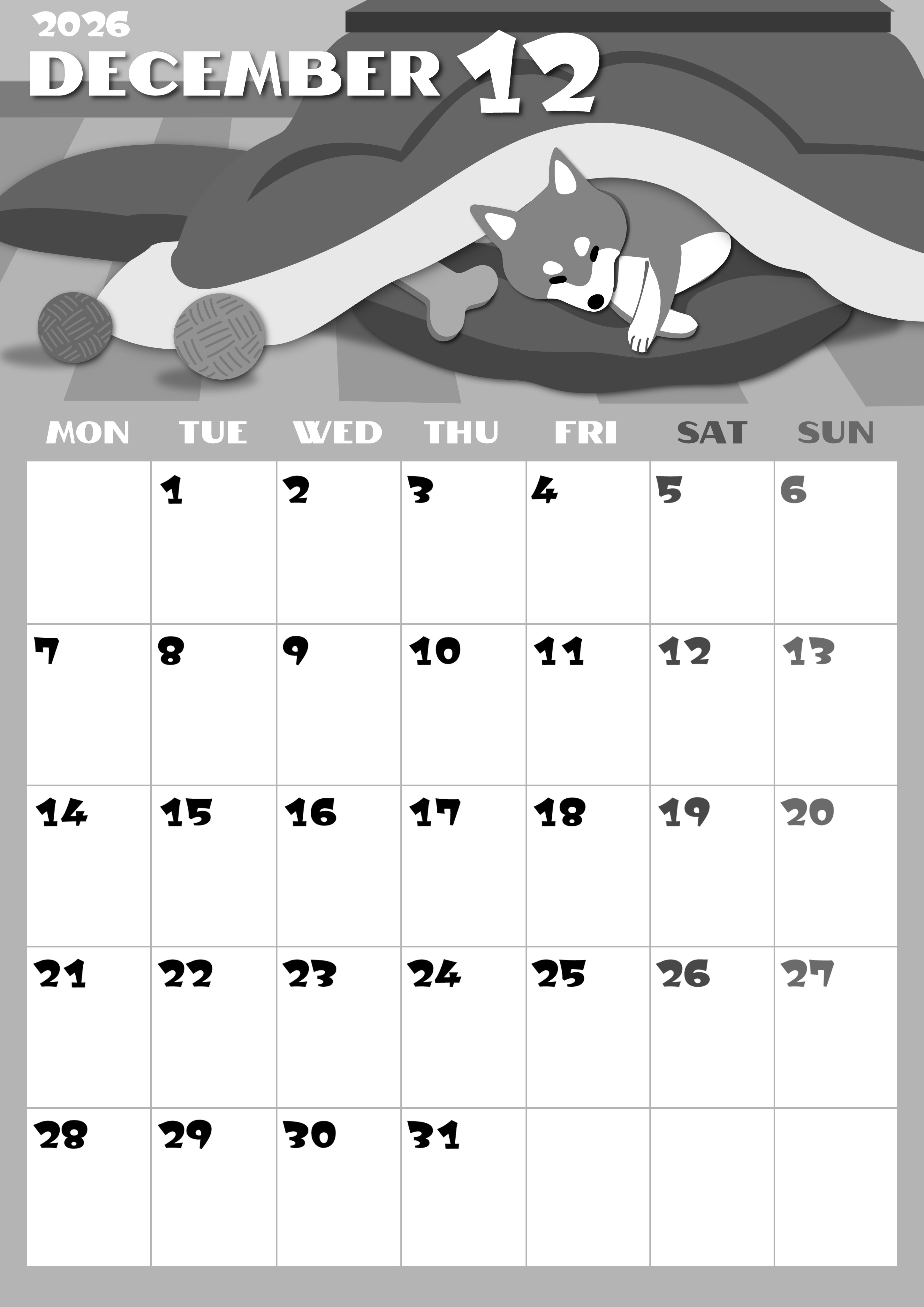 2026年・無料のカレンダーテンプレート 2026年12月縦型モノクロの月曜始まり 柴犬イラストのかわいいA4無料白黒カレンダー(2026-00401211) 素材状デザイン王 2025年4月1日 2026年12月縦型モノクロの月曜始まりの無料テンプレート白黒カレンダーです。炬燵の中で柴犬がぬくぬくしているかわいいイラストです。月曜始まりで年末の忙しい予定を整理整頓するのに適しています。(2026-00401211) 12月 縦型のカレンダー 月曜始まり 白黒 カレンダーデザイン-0040