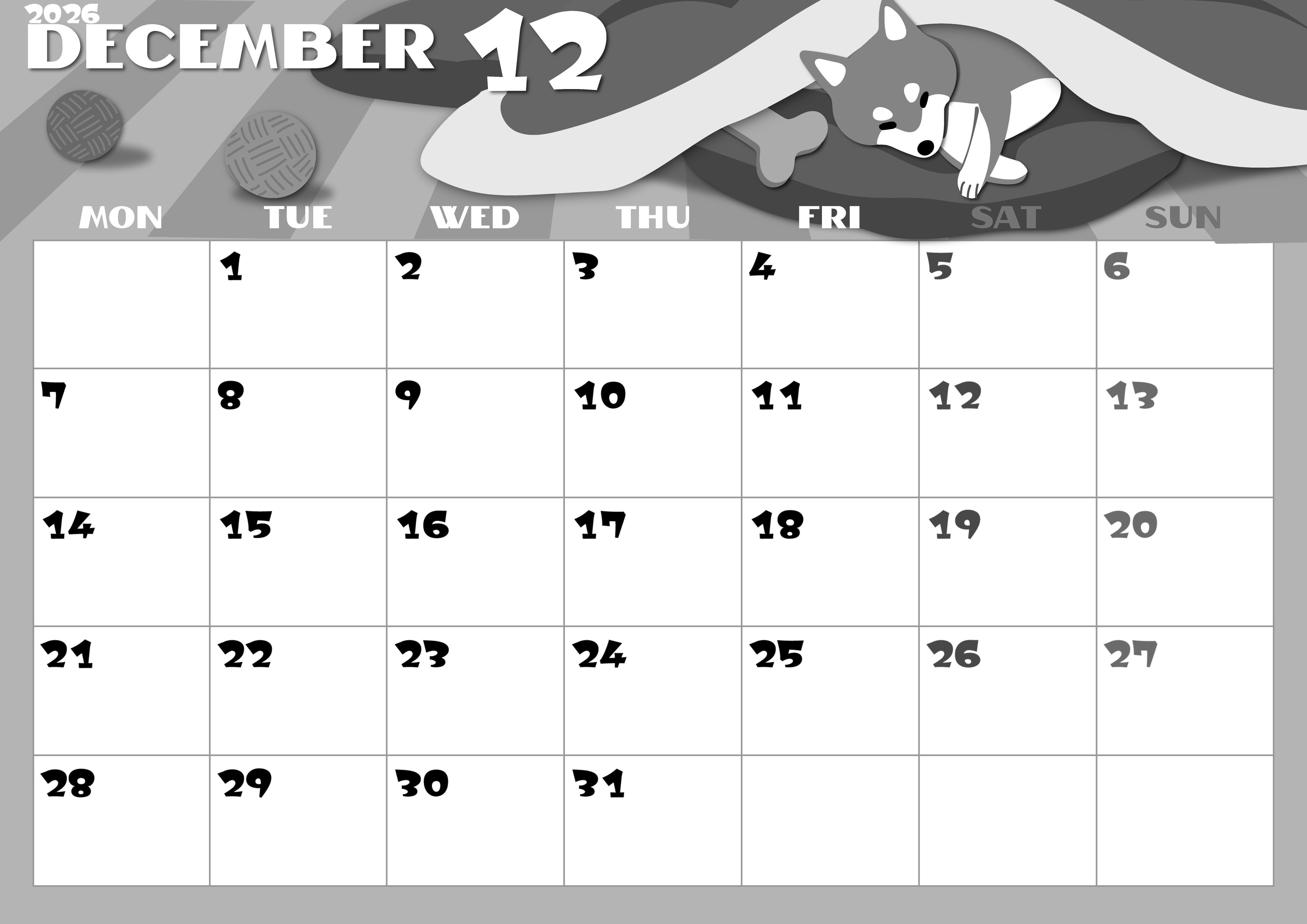 2026年12月横型モノクロの月曜始まりの無料テンプレート白黒カレンダーです。柴犬が主役になっている犬好き動物好きな人に気に入ってもらえるようなかわいいイラストです。月曜始まりでスケジュール管理に向いています。(2026-00401201)