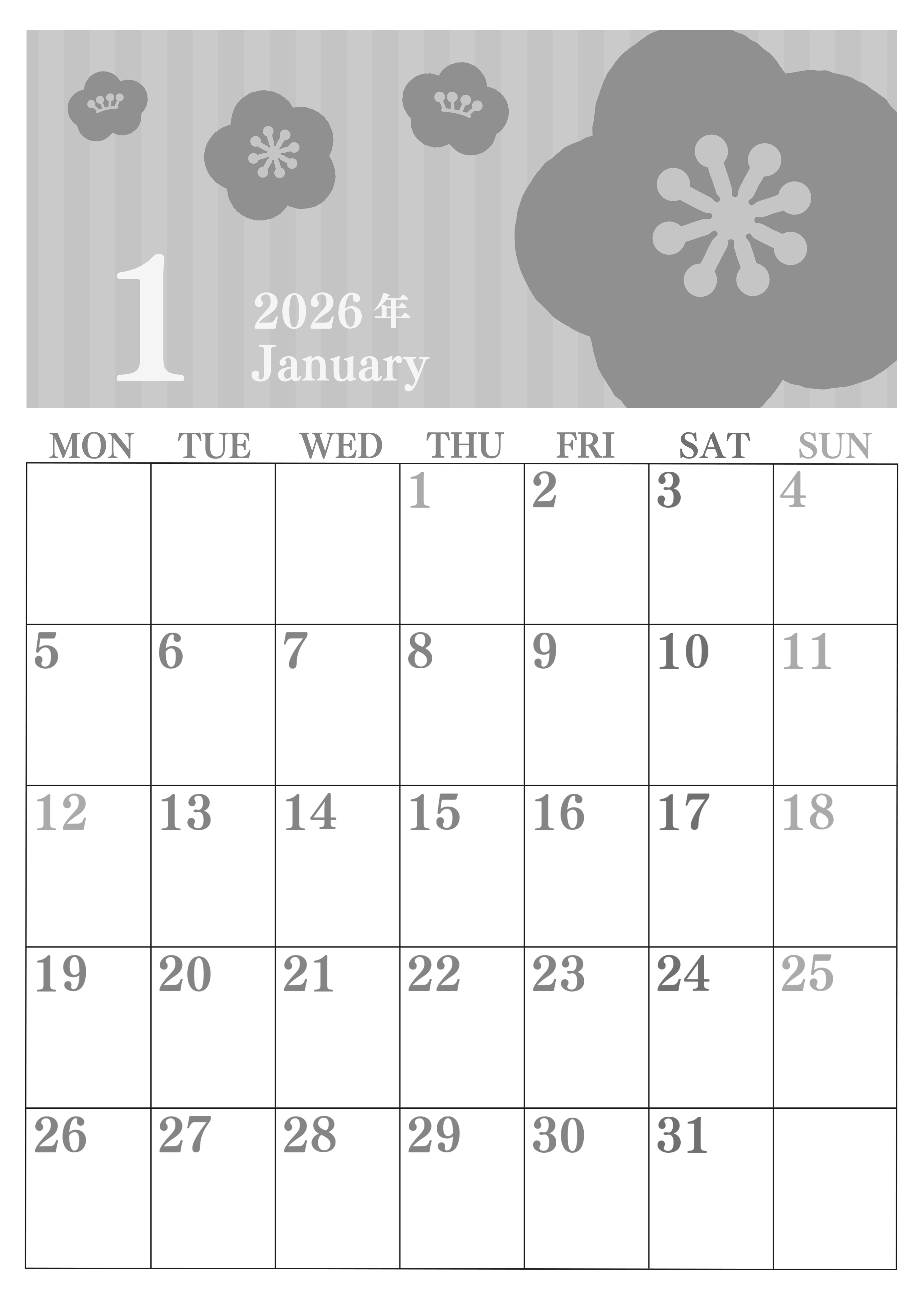 2026年1月縦型モノクロの月曜始まり白黒カレンダーです。丸みを帯びた花のイラストはシンプルさとおしゃれさを兼ね備えています。寒い冬でも気持ちを温めてくれるような白黒カレンダーです。(2026-00410111)