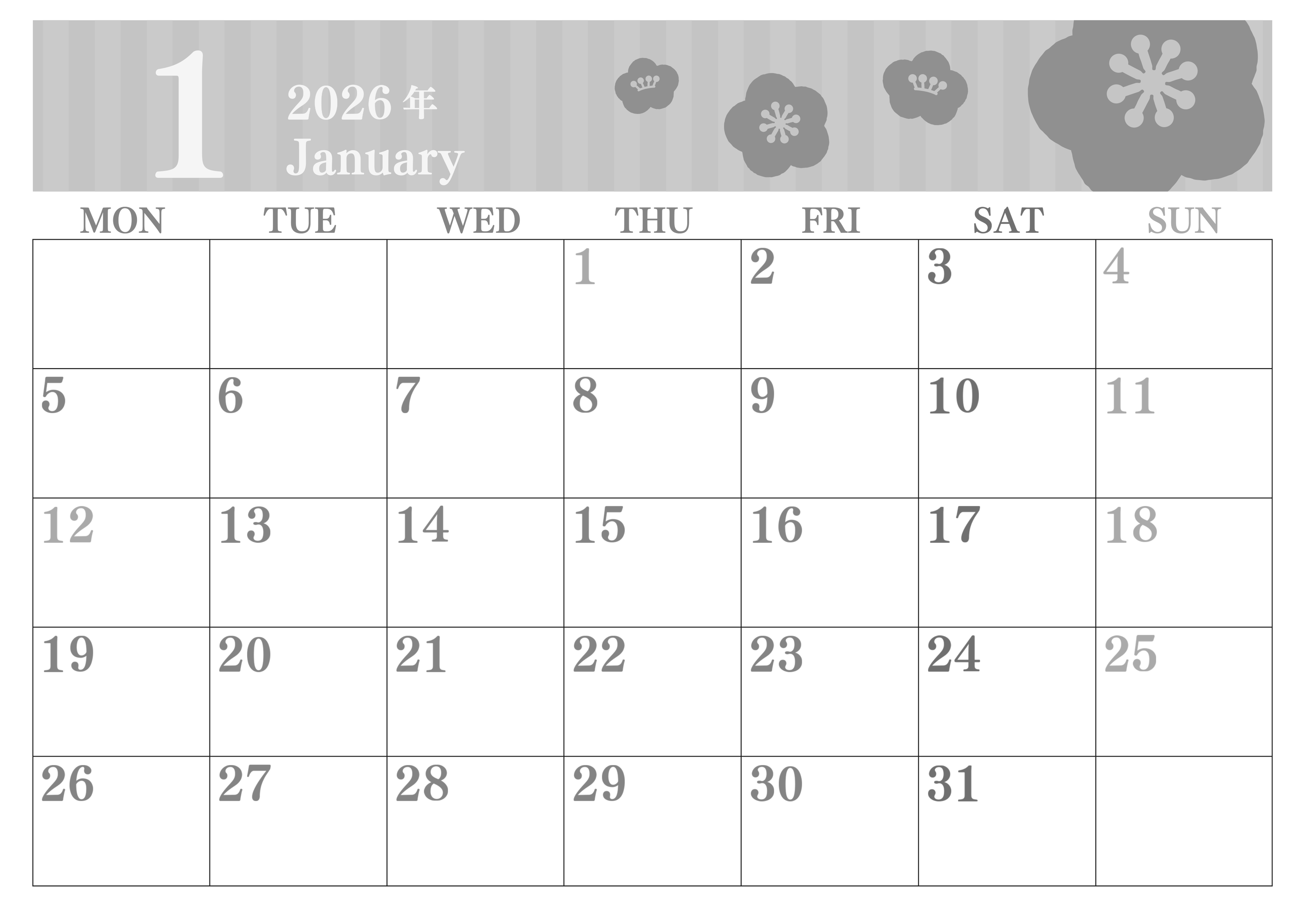 2026年1月横型モノクロの月曜始まり白黒カレンダーです。いろいろなサイズの赤く成熟した梅の花がポップでかわいいです。1月のフォントは明朝体に近く白色ですっきりとおしゃれなデザインです。イラスト付きでりながらもダウンロードが無料で気軽に使える白黒カレンダーです。(2026-00410101)