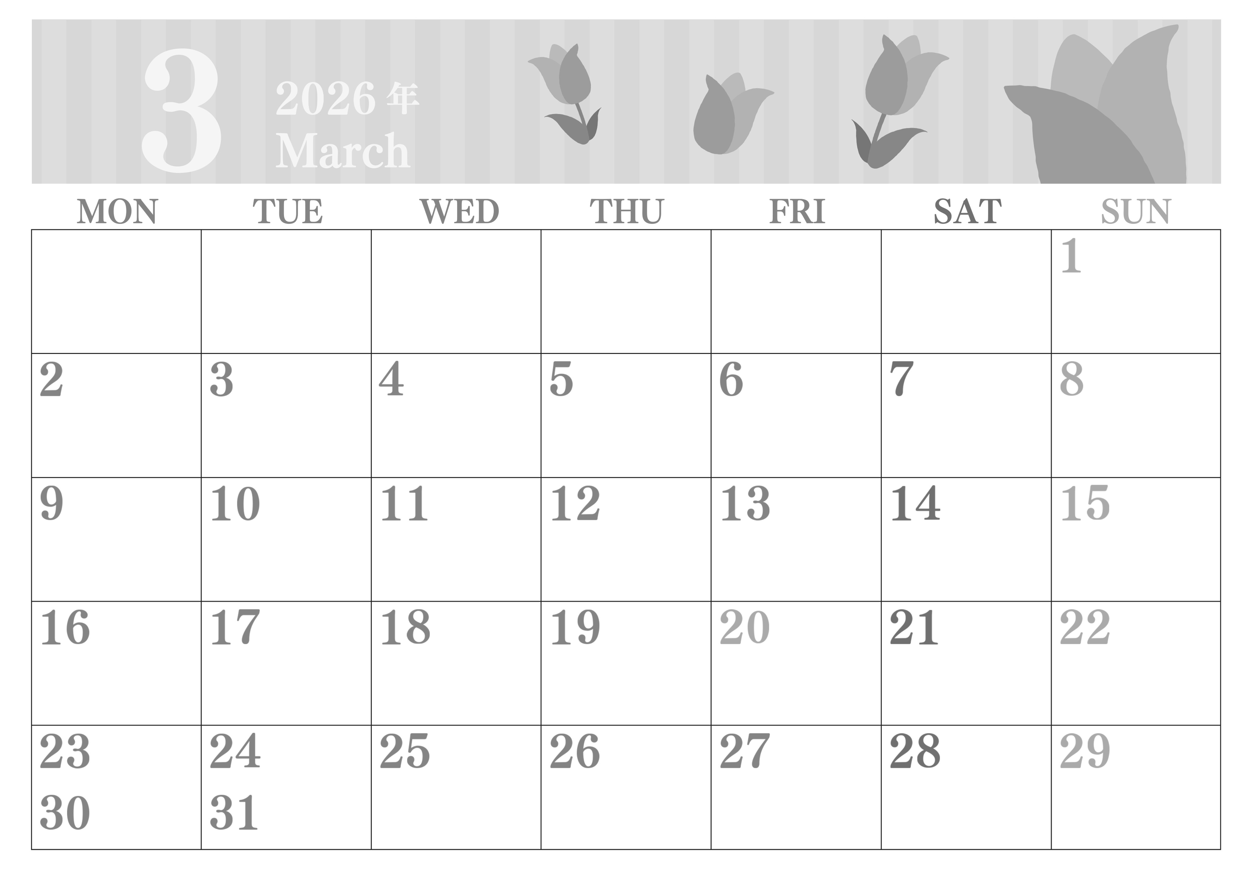 2026年・無料のカレンダーテンプレート 2026年3月横型モノクロの月曜始まり 季節の花イラストのおしゃれA4無料白黒カレンダー(2026-00410301) 素材状デザイン王 2025年4月1日 2026年3月横型モノクロの月曜始まりの無料テンプレート白黒カレンダーです。月曜始まりなので便利な白黒カレンダーです。季節の花であるぷっくりとしたチューリップのイラストがあざやかでかわいいです。(2026-00410301) 3月 横型のカレンダー 月曜始まり 白黒 カレンダーデザイン-0041
