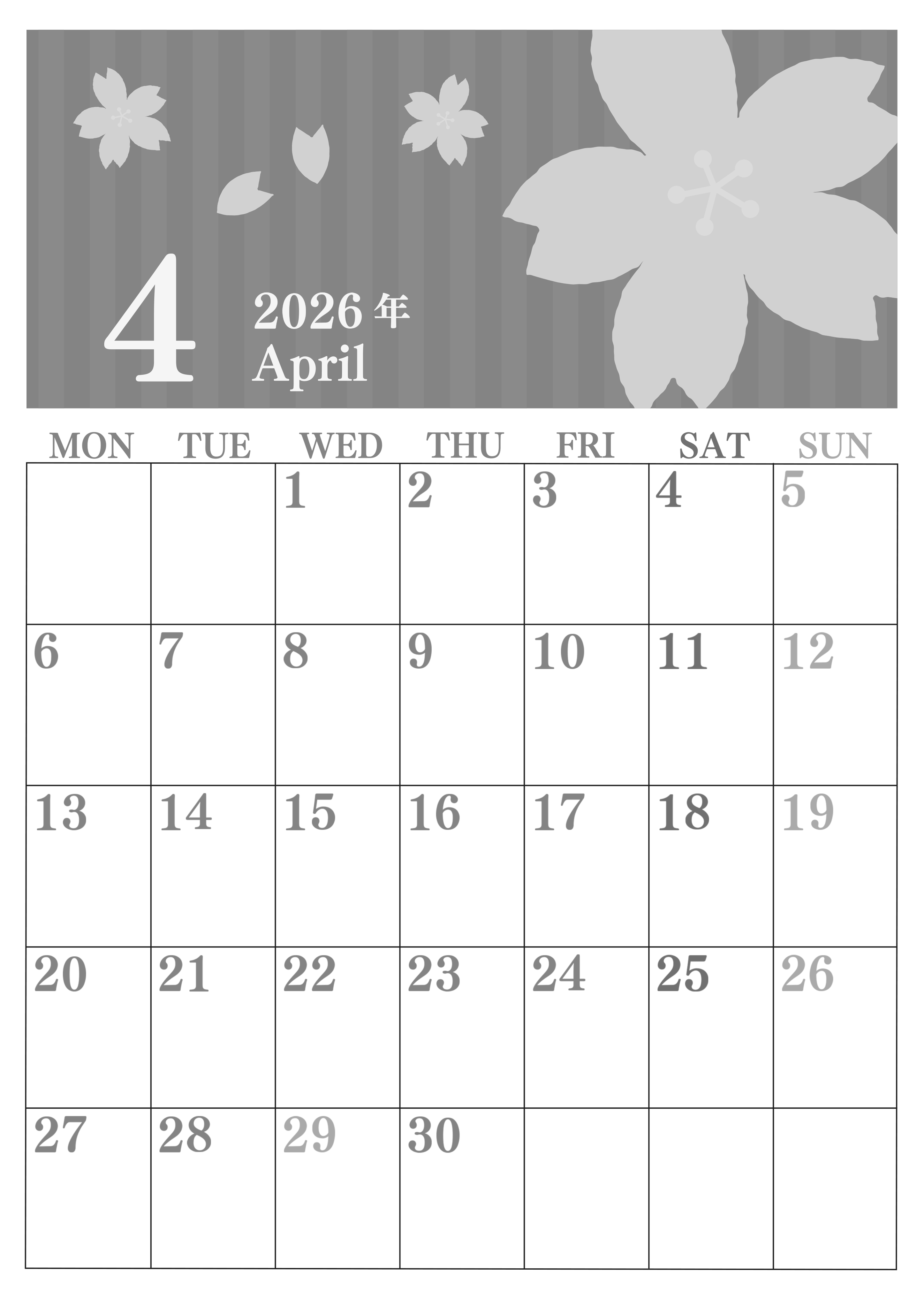 2026年4月縦型モノクロの月曜始まりの無料テンプレート白黒カレンダーです。大きな桜が春らしい雰囲気を白黒カレンダーに添えているおしゃれなイラスト付きのフリー素材です。月曜始まりの白黒カレンダーが好きな人におすすめしています。(2026-00410411)