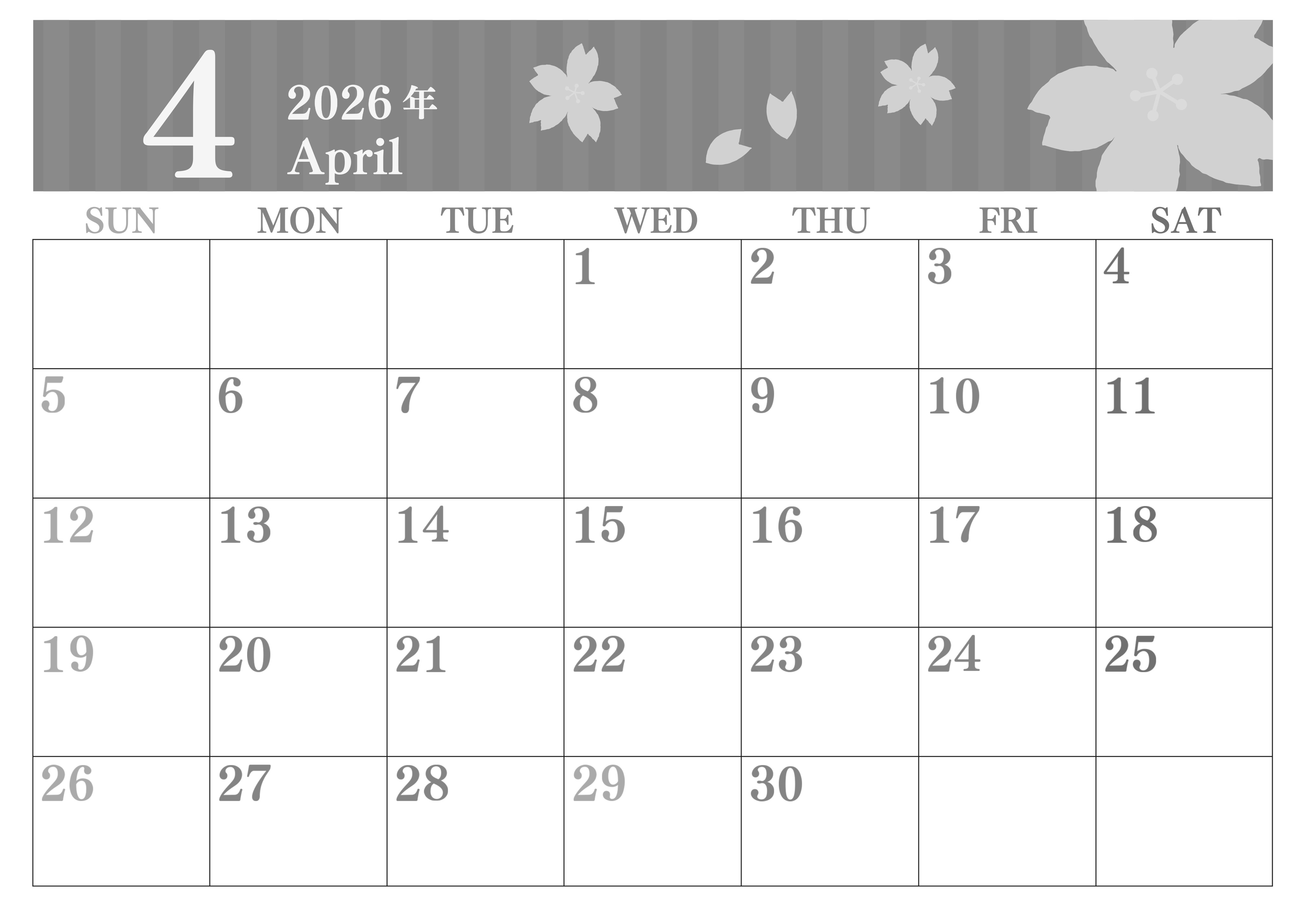 2026年4月横型モノクロの日曜始まりの無料テンプレート白黒カレンダーです。和風で春らしい落ち着いたおしゃれなイラストが背景に映える白黒カレンダーです。A4サイズなので無料でダウンロードをしたら印刷してすぐに使えます。(2026-00410400)