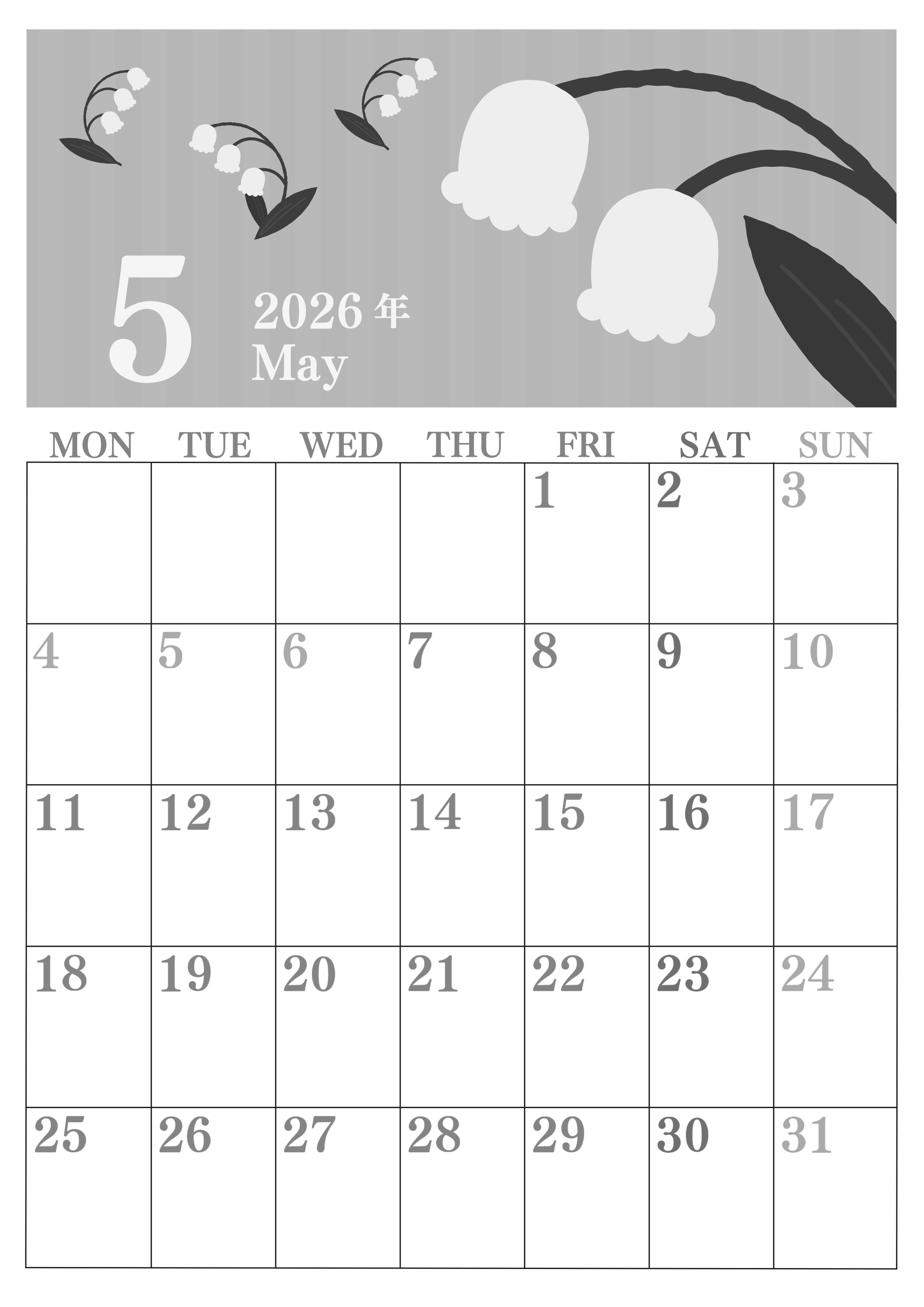 2026年5月縦型モノクロの月曜始まりの無料テンプレート白黒カレンダーです。月曜始まりで勉強や仕事のプランニングに向いている白黒カレンダーでありながらも季節の花のイラストがシンプル過ぎず派手すぎないおしゃれなデザインで親しみが持てます。(2026-00410511)