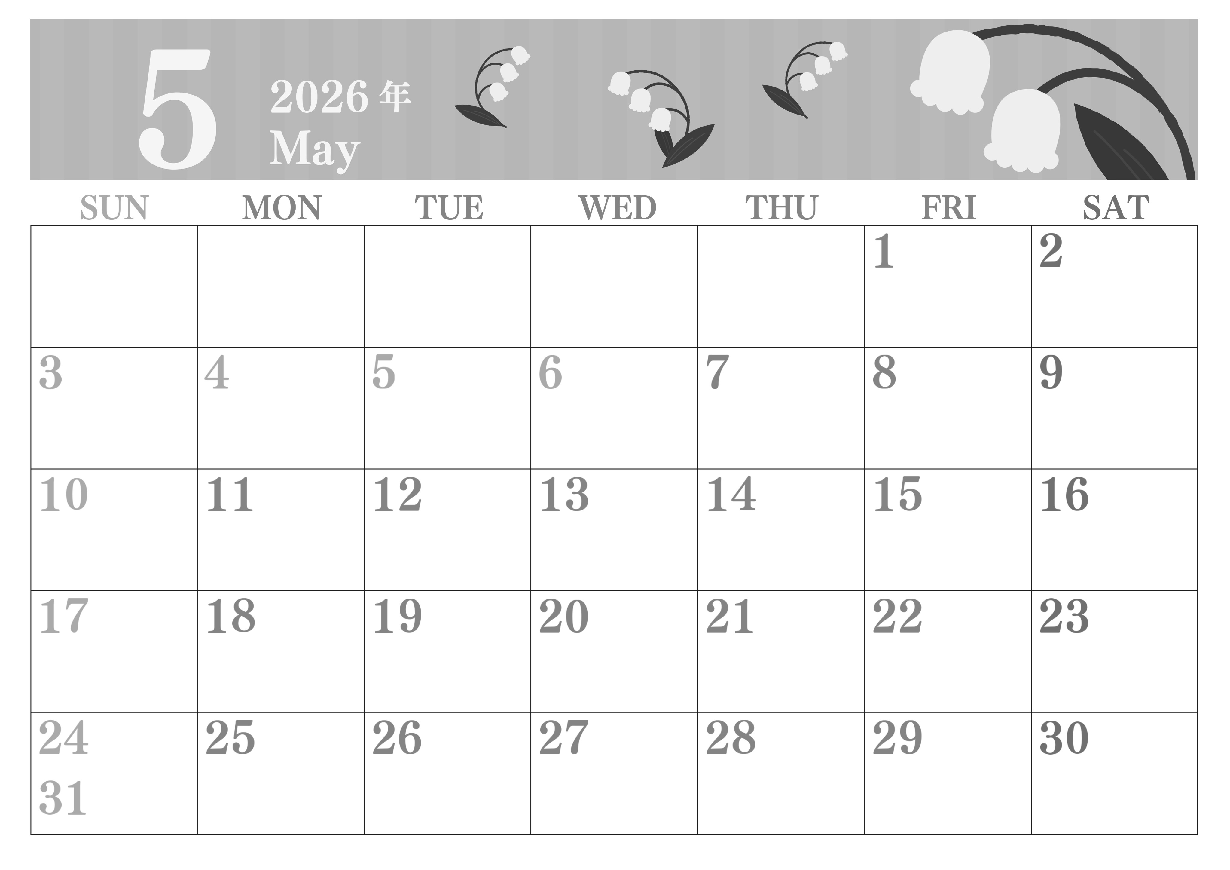 2026年5月横型モノクロの日曜始まりの無料テンプレート白黒カレンダーです。おちついた季節の花であるすずらんのイラストが素朴でおしゃれで大人っぽい白黒カレンダーです。白紙に印刷するだけで簡単便利です。(2026-00410500)