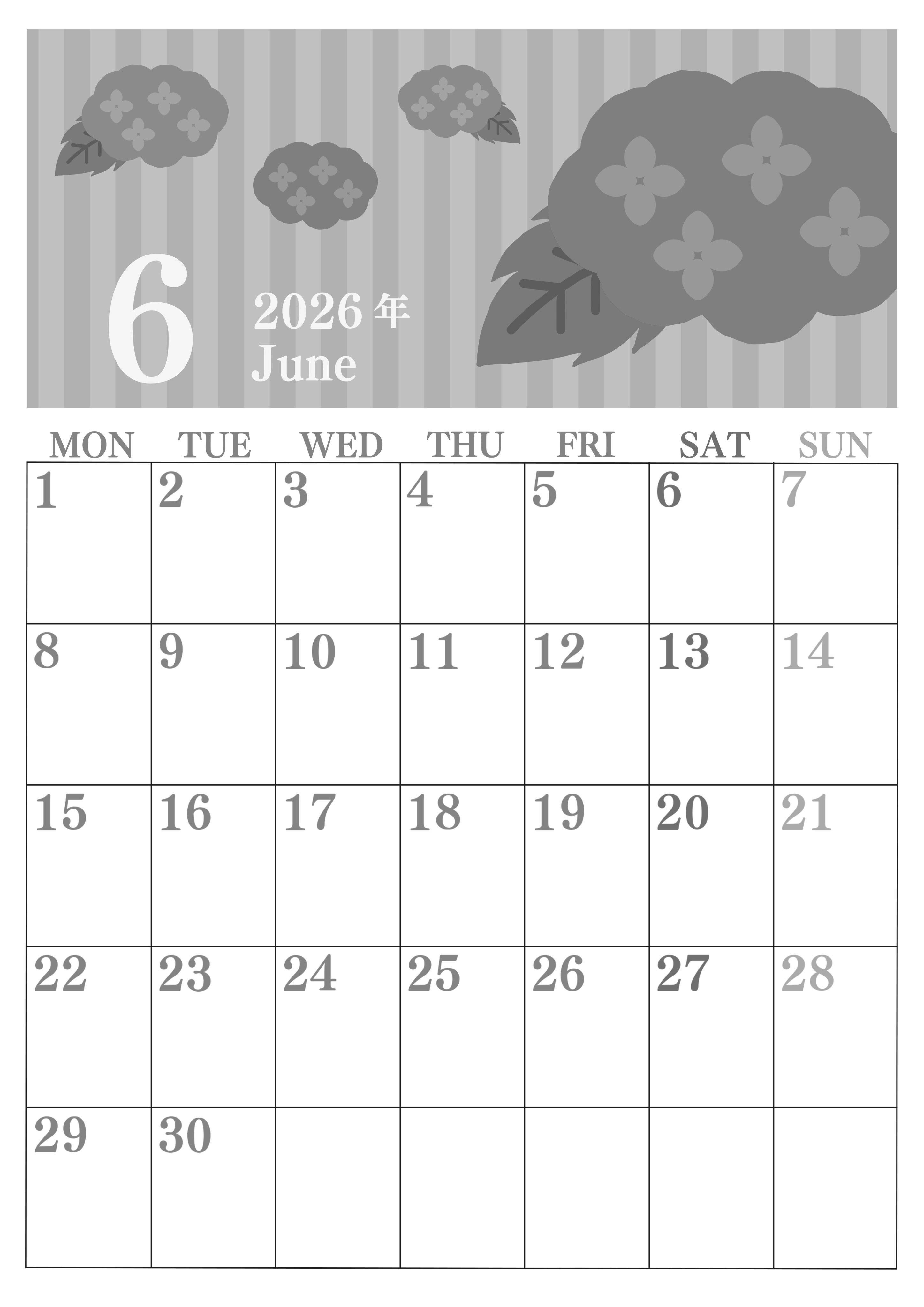 2026年6月縦型モノクロの月曜始まりの無料テンプレート白黒カレンダーです。月曜始まりでビジネスタスク管理に適している無料ダウンロードが簡単にできる白黒カレンダーです。アジサイのイラストも落ち着いていておしゃれです。(2026-00410611)