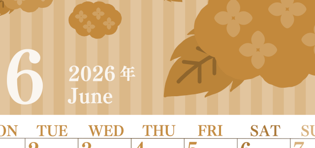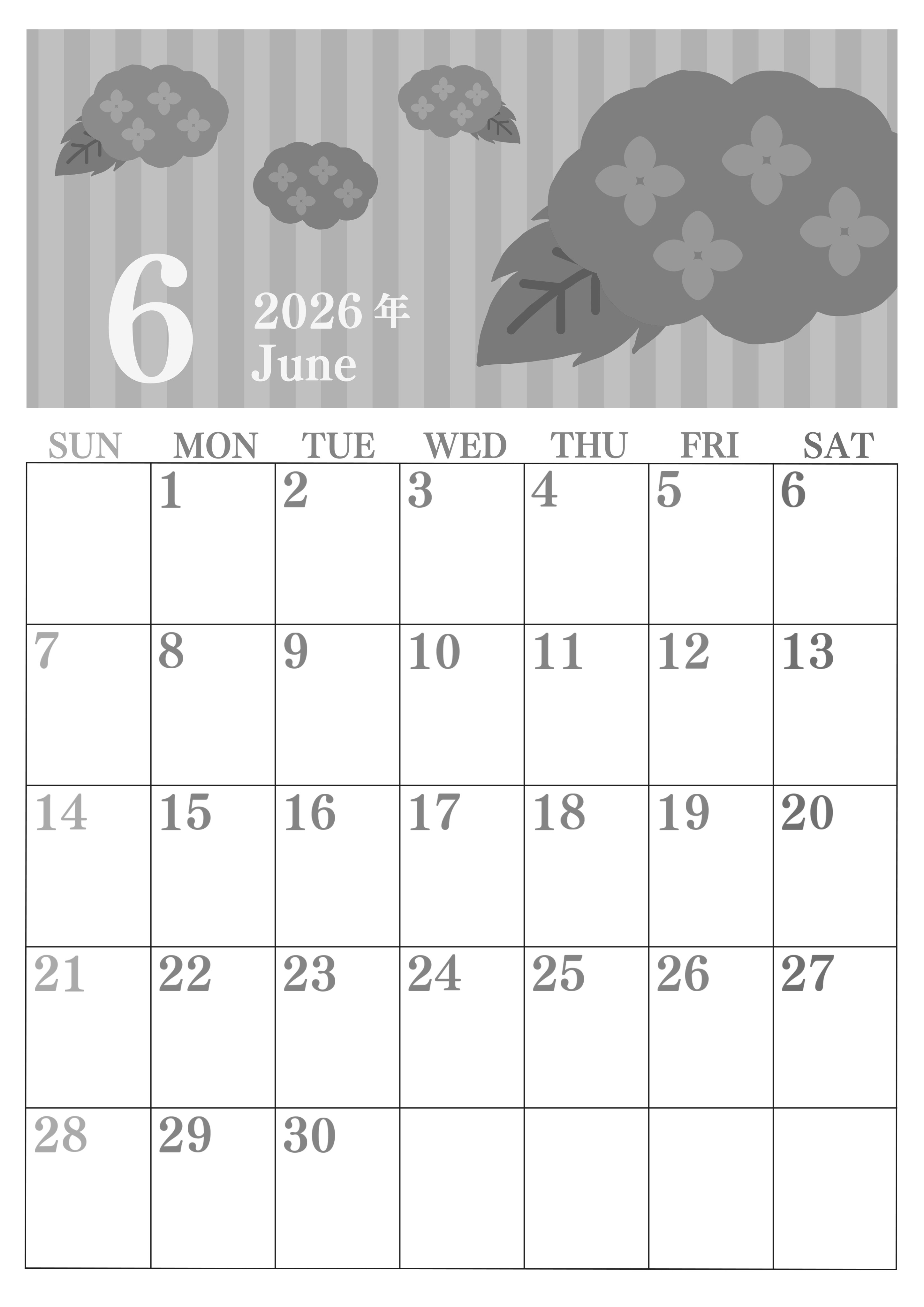 2026年6月縦型モノクロの日曜始まりの無料テンプレート白黒カレンダーです。縦縞を背景にして大きめのアジサイのイラストが描かれているおしゃれでスタイリッシュな白黒カレンダーです。タスク管理をするのに便利です。(2026-00410610)