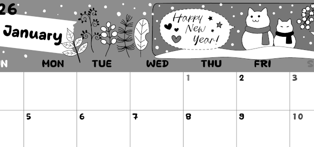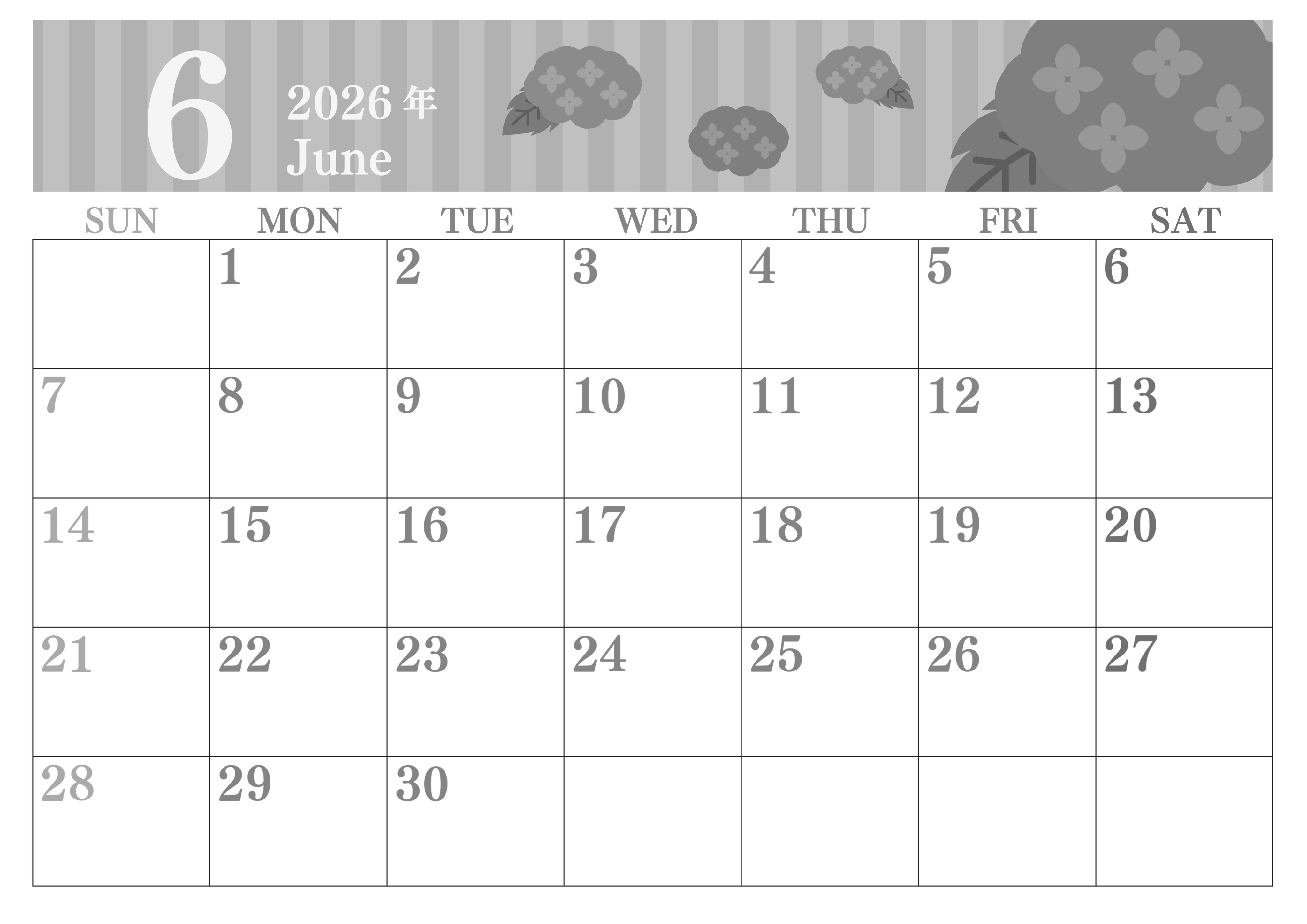 2026年6月横型モノクロの日曜始まりの無料テンプレート白黒カレンダーです。落ち着いたシックな色合いで描かれたアジサイがおしゃれなイラストです。白黒カレンダーは罫線が分かりやすく引かれているので手書き利用に向いています。(2026-00410600)