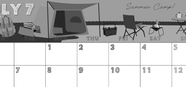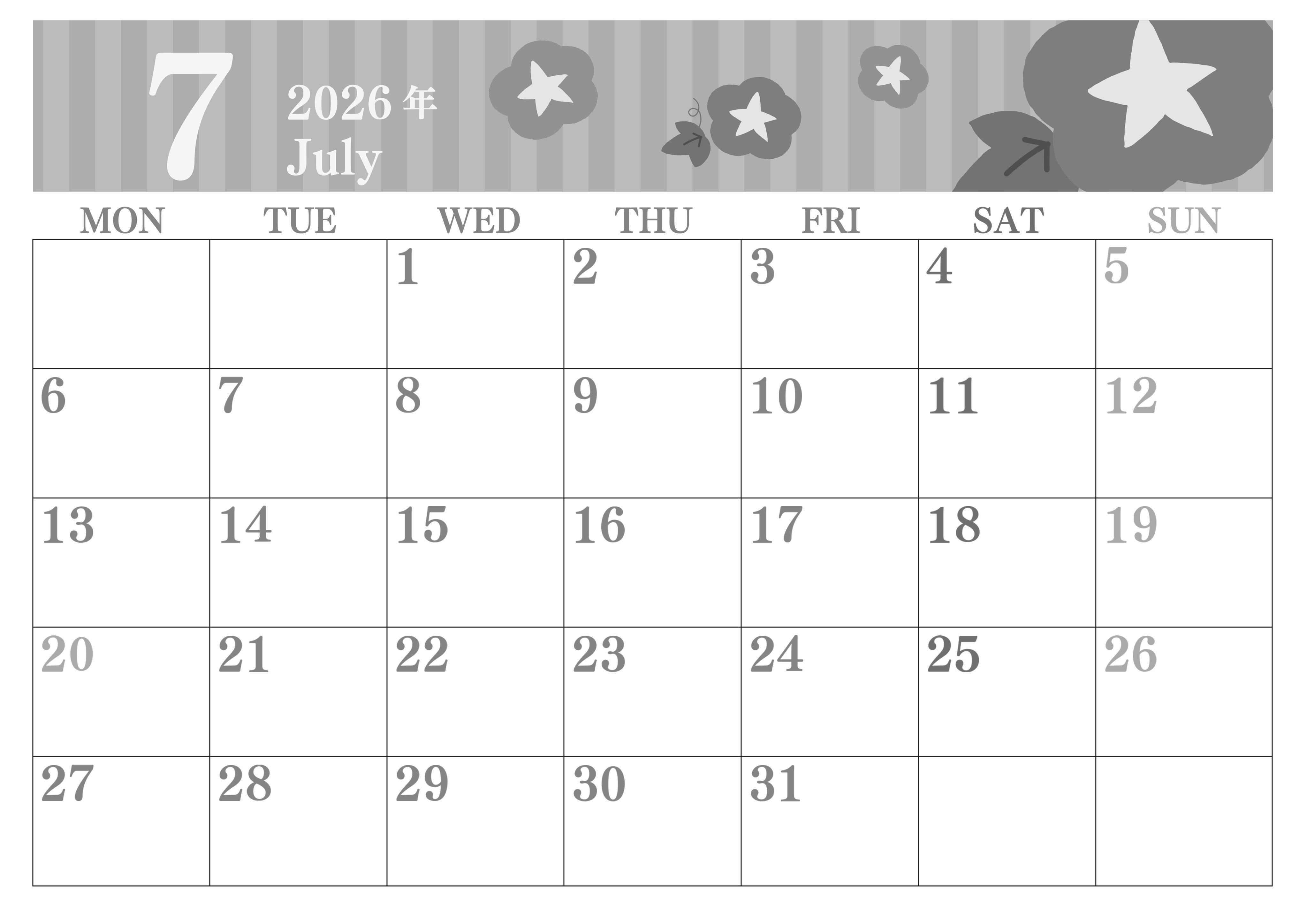 2026年7月横型モノクロの月曜始まりの無料テンプレート白黒カレンダーです。月曜始まり白黒カレンダーを使いたい人におすすめな朝顔のイラストがかわいい存在感のある無料素材となっています。(2026-00410701)