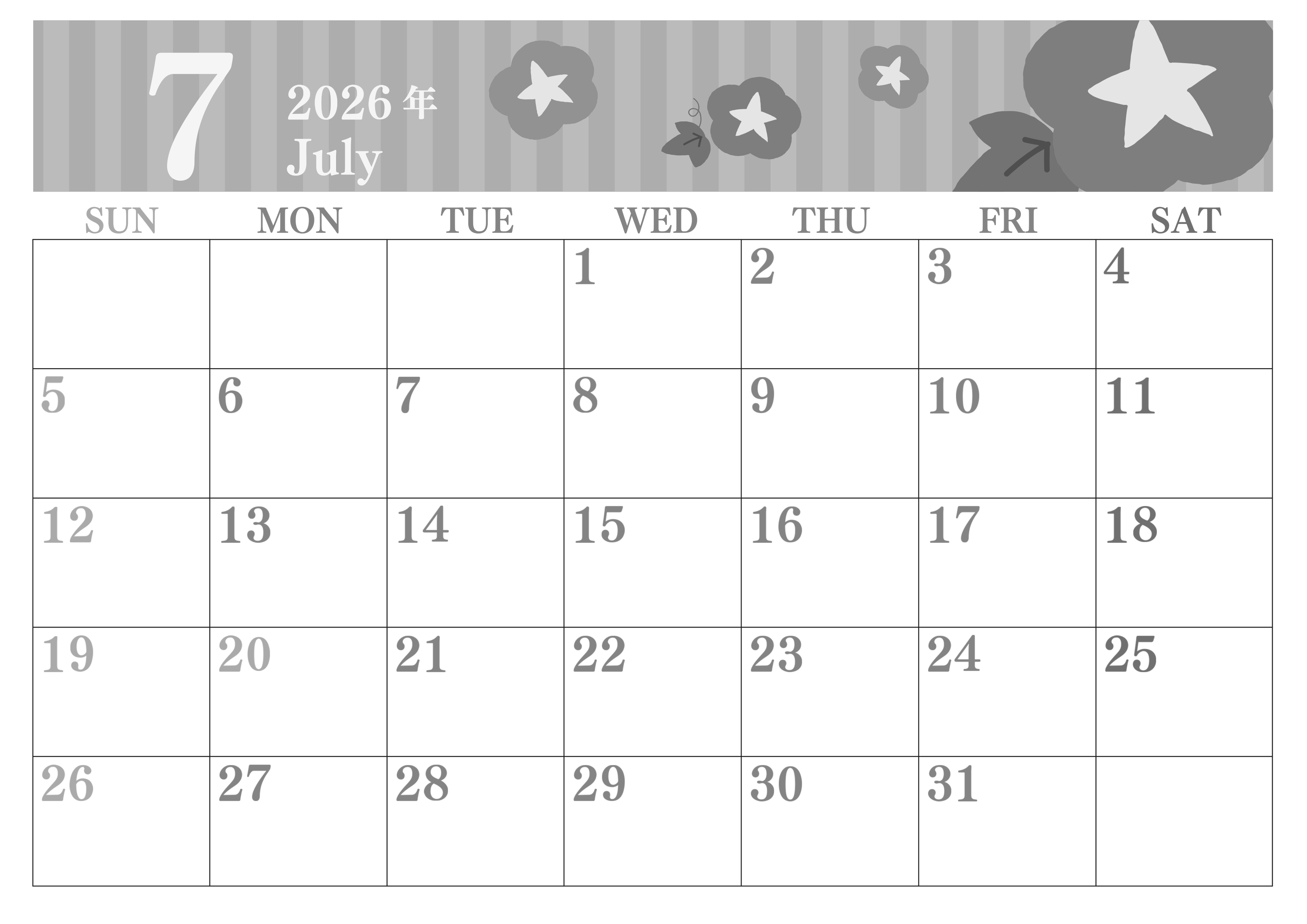 2026年7月横型モノクロの日曜始まりの無料テンプレート白黒カレンダーです。丸みを帯びた鮮やかな朝顔のイラストがおしゃれで使うのが楽しくなるような日曜始まりのA4サイズで無料の白黒カレンダーとなっています。(2026-00410700)