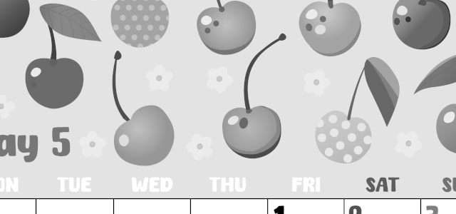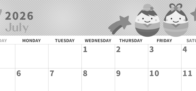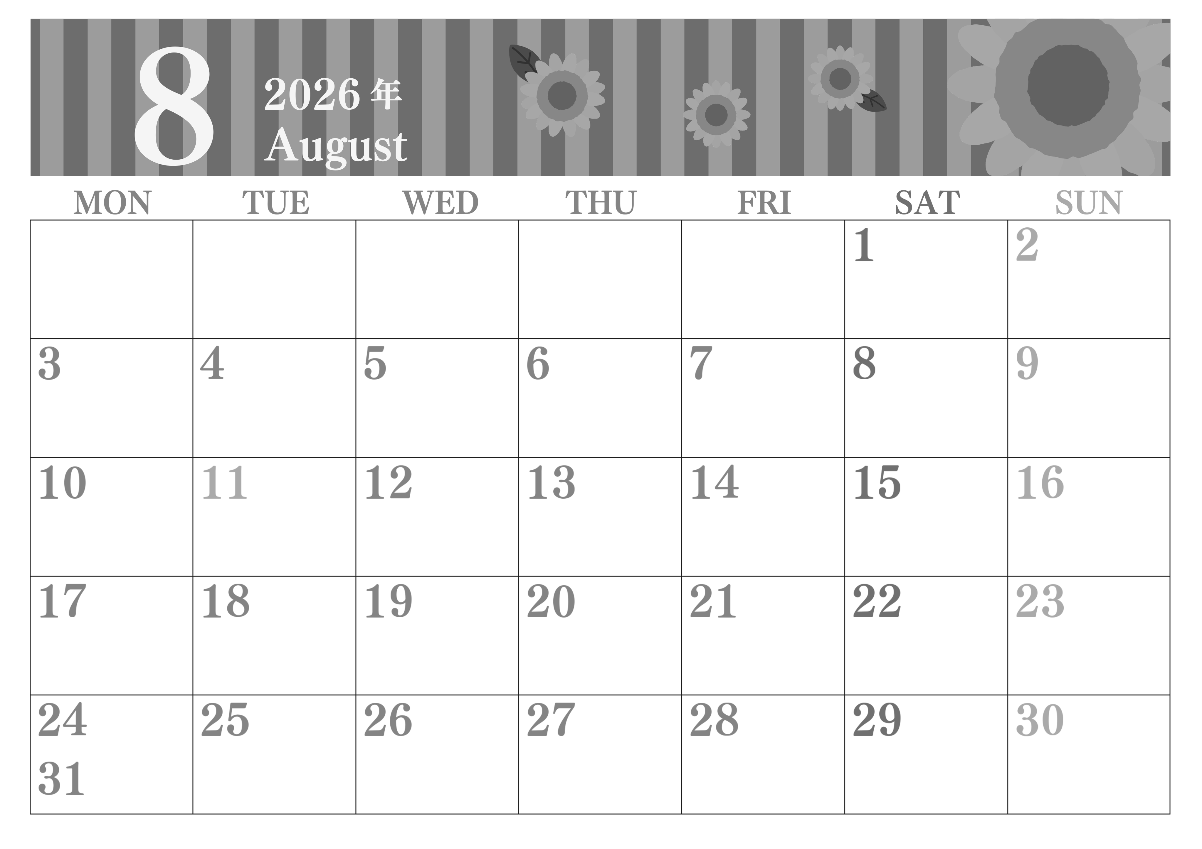 2026年8月横型モノクロの月曜始まりの無料テンプレート白黒カレンダーです。真夏をテーマにしたイラストがかわいいだけでなく月曜始まりで曜日の文字が色分けされた実用性がとても高い無料で使える白黒カレンダーです。(2026-00410801)