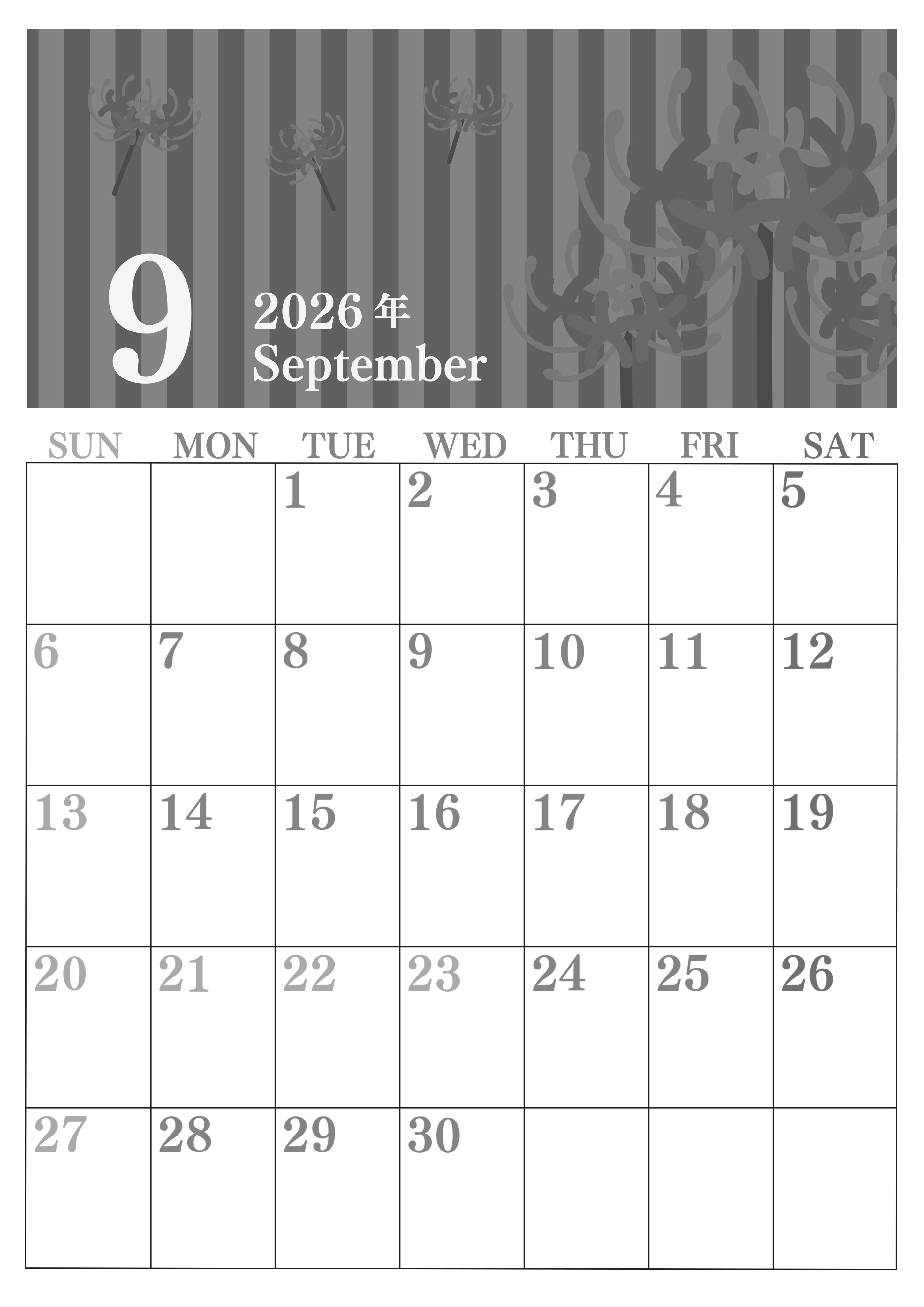 2026年9月縦型モノクロの日曜始まりの無料テンプレート白黒カレンダーです。縦島の背景に赤が鮮やかな彼岸花のイラストが大きく描かれていておしゃれな風格をまとっているイラスト白黒カレンダーに仕上がっています。(2026-00410910)
