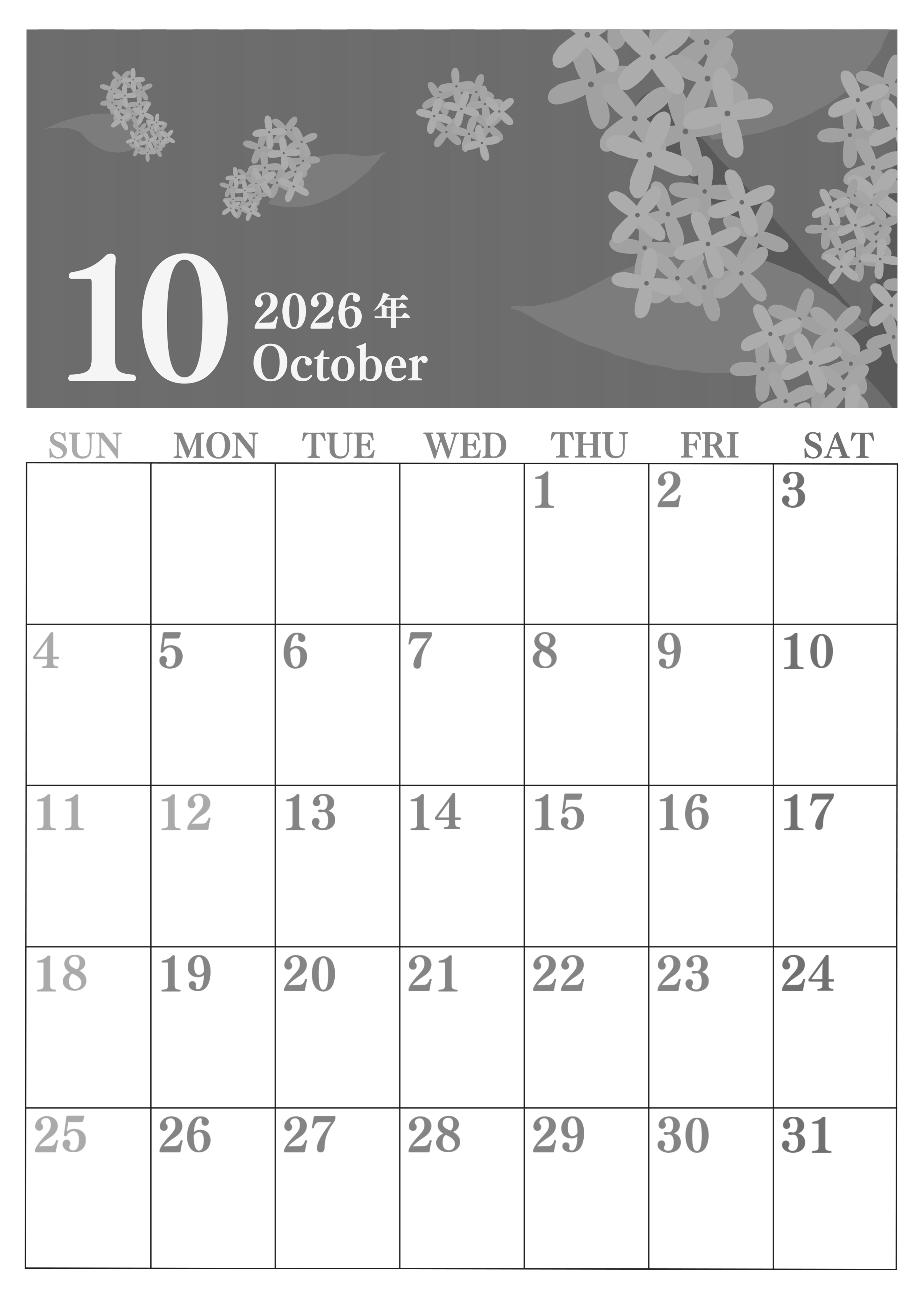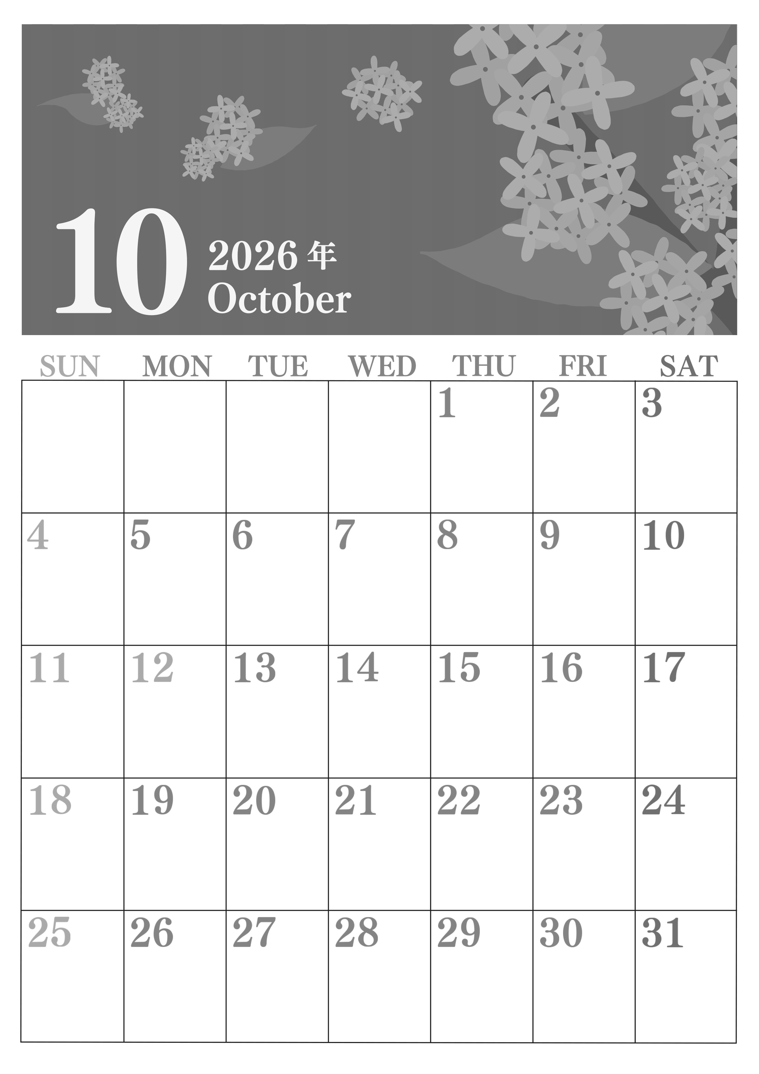 2026年10月縦型モノクロの日曜始まりの無料テンプレート白黒カレンダーです。金木製があちこちに咲いている様子を描いたおしゃれイラストになっています。罫線がまっすぐ引かれていて余白も多いので大きな文字で書き込めます。(2026-00411010)