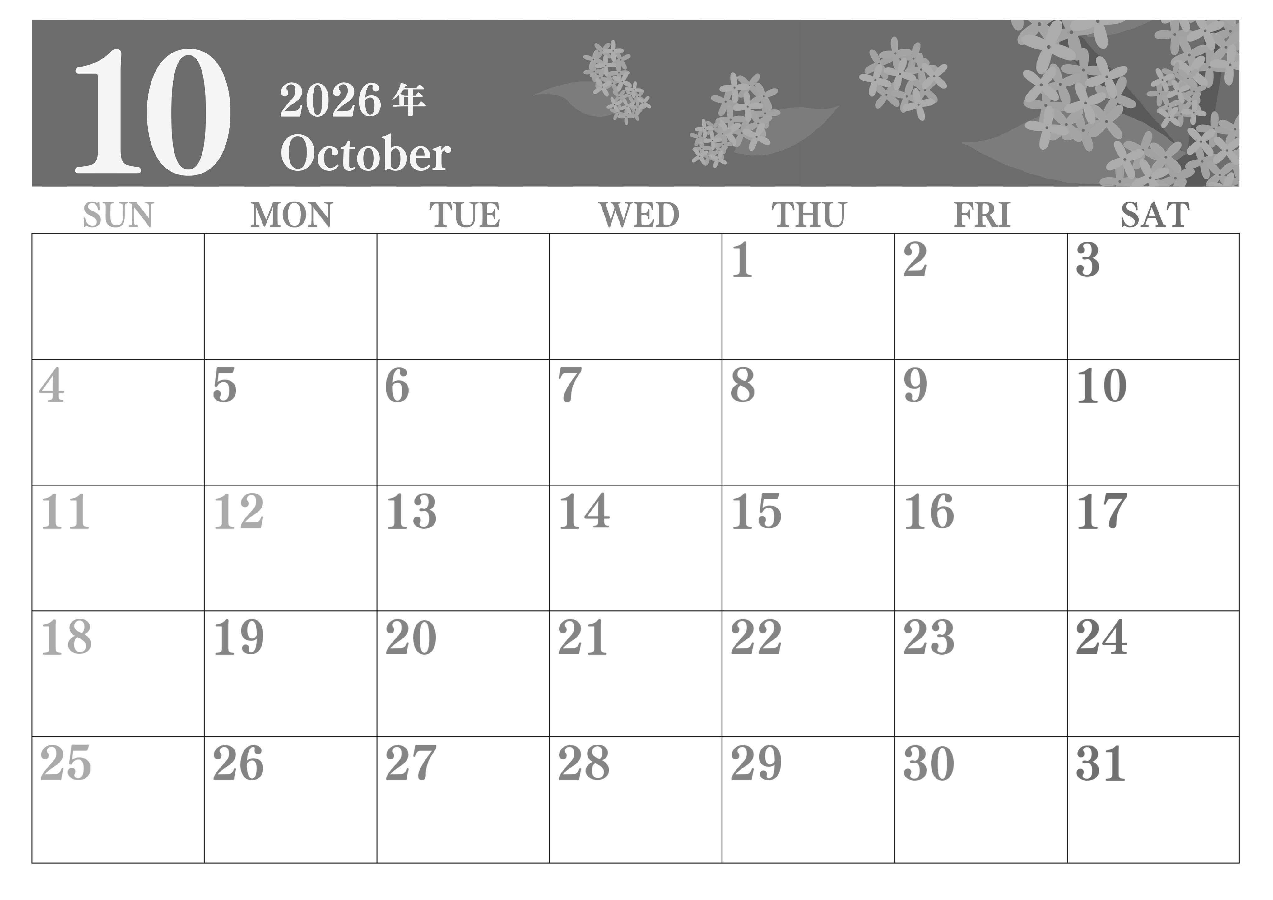 2026年10月横型モノクロの日曜始まり 金木犀イラストのおしゃれA4無料白黒カレンダー(2026-00411000)