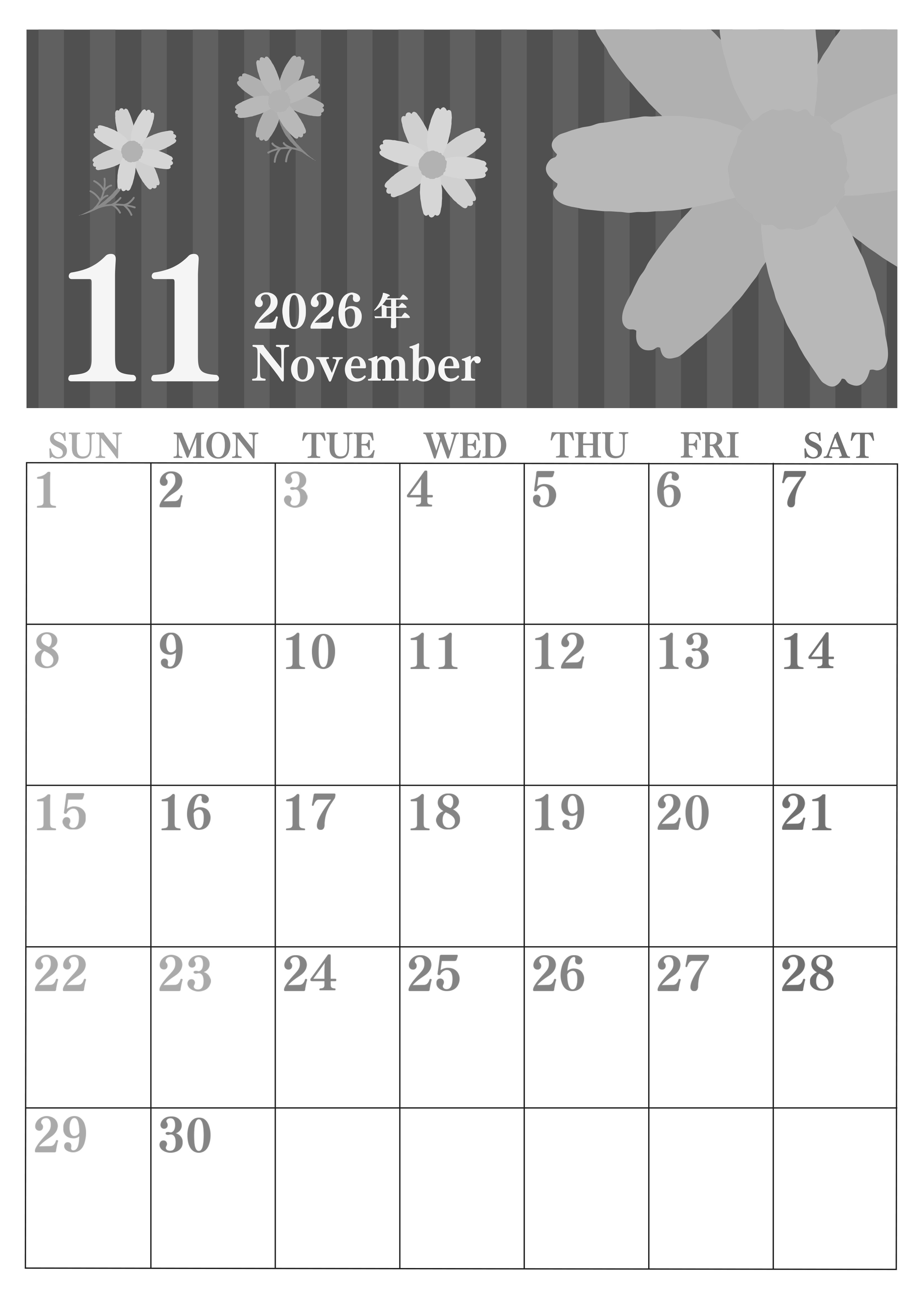 2026年・無料のカレンダーテンプレート 2026年11月縦型モノクロの日曜始まり 秋桜イラストのおしゃれA4無料白黒カレンダー(2026-00411110) 素材状デザイン王 2025年4月1日 2026年11月縦型モノクロの日曜始まりの無料テンプレート白黒カレンダーです。秋桜のイラストがおしゃれです。縦向きなので壁に画鋲やテープやシールで張り付けて見れるようにすると良いです。(2026-00411110) 11月 縦型のカレンダー 日曜始まり 白黒 カレンダーデザイン-0041