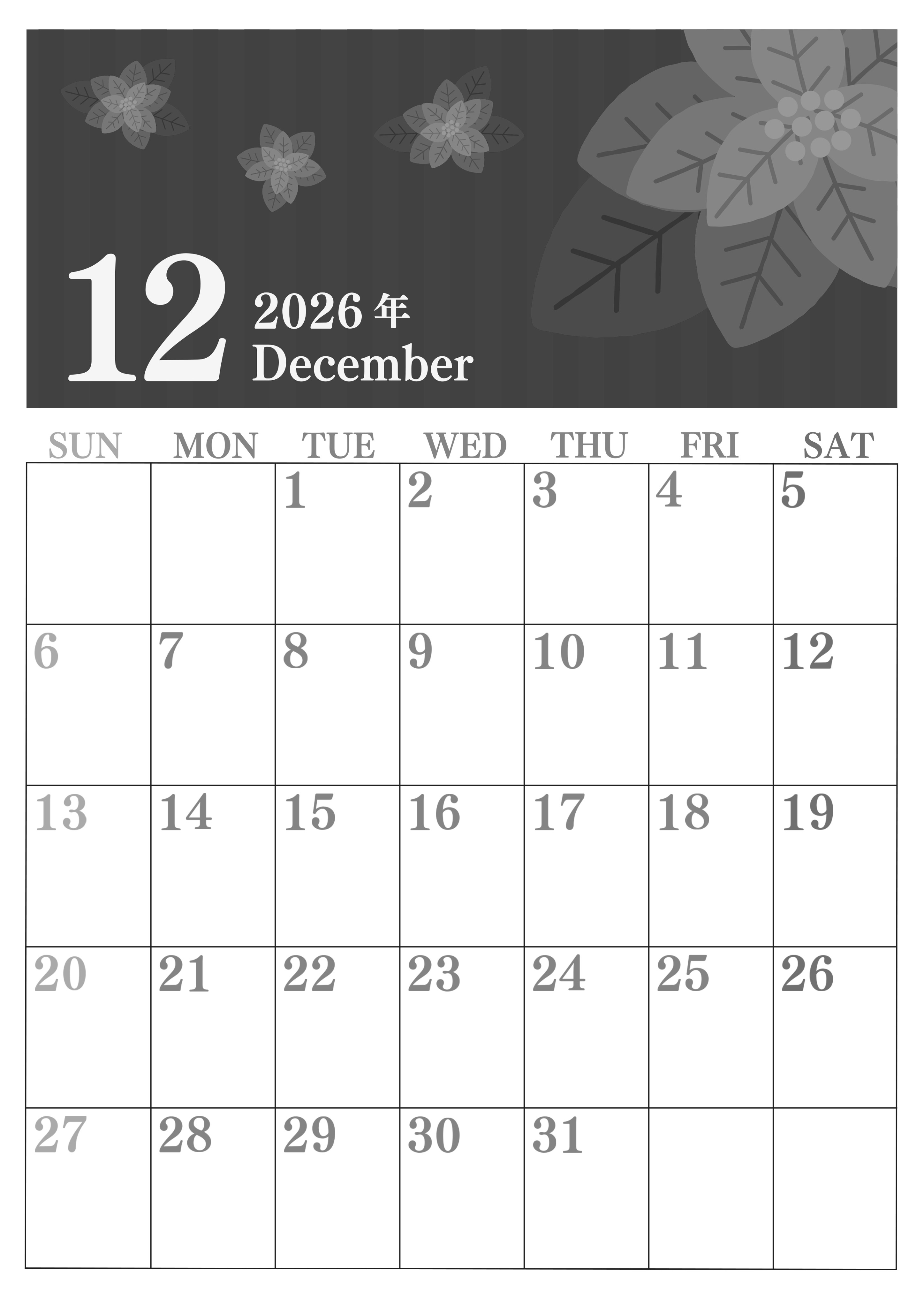 2026年12月縦型モノクロの日曜始まりの無料テンプレート白黒カレンダーです。ポインセチアが大きく華やかに描かれているおしゃれなイラストです。罫線をまっすぐ引いていて見やすいレイアウトになっています。(2026-00411210)