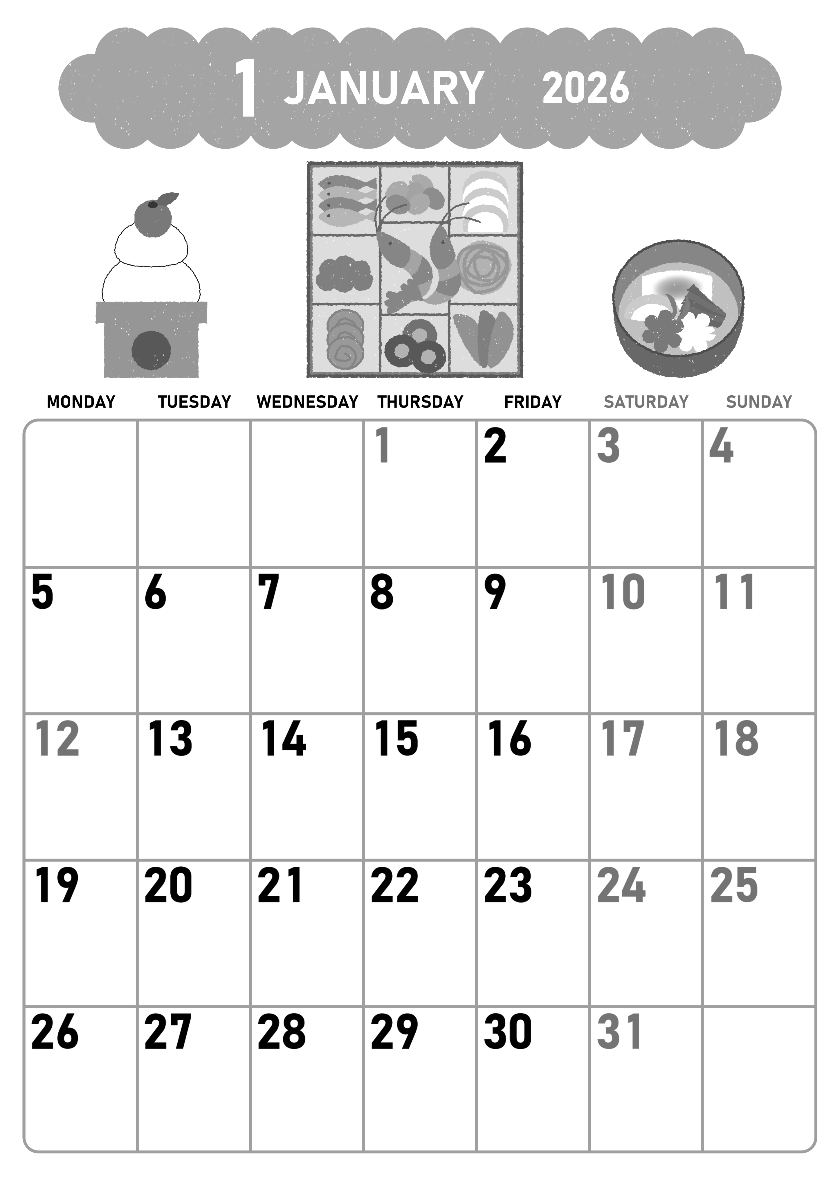 2026年1月縦型モノクロの月曜始まり白黒カレンダーです。1月January2026年が目立つように派手かつかわいい白黒カレンダーです。お節をはじめとした鏡餅やお雑煮といった豪華なお料理のイラストもチャーミングな白黒カレンダーです。(2026-00420111)