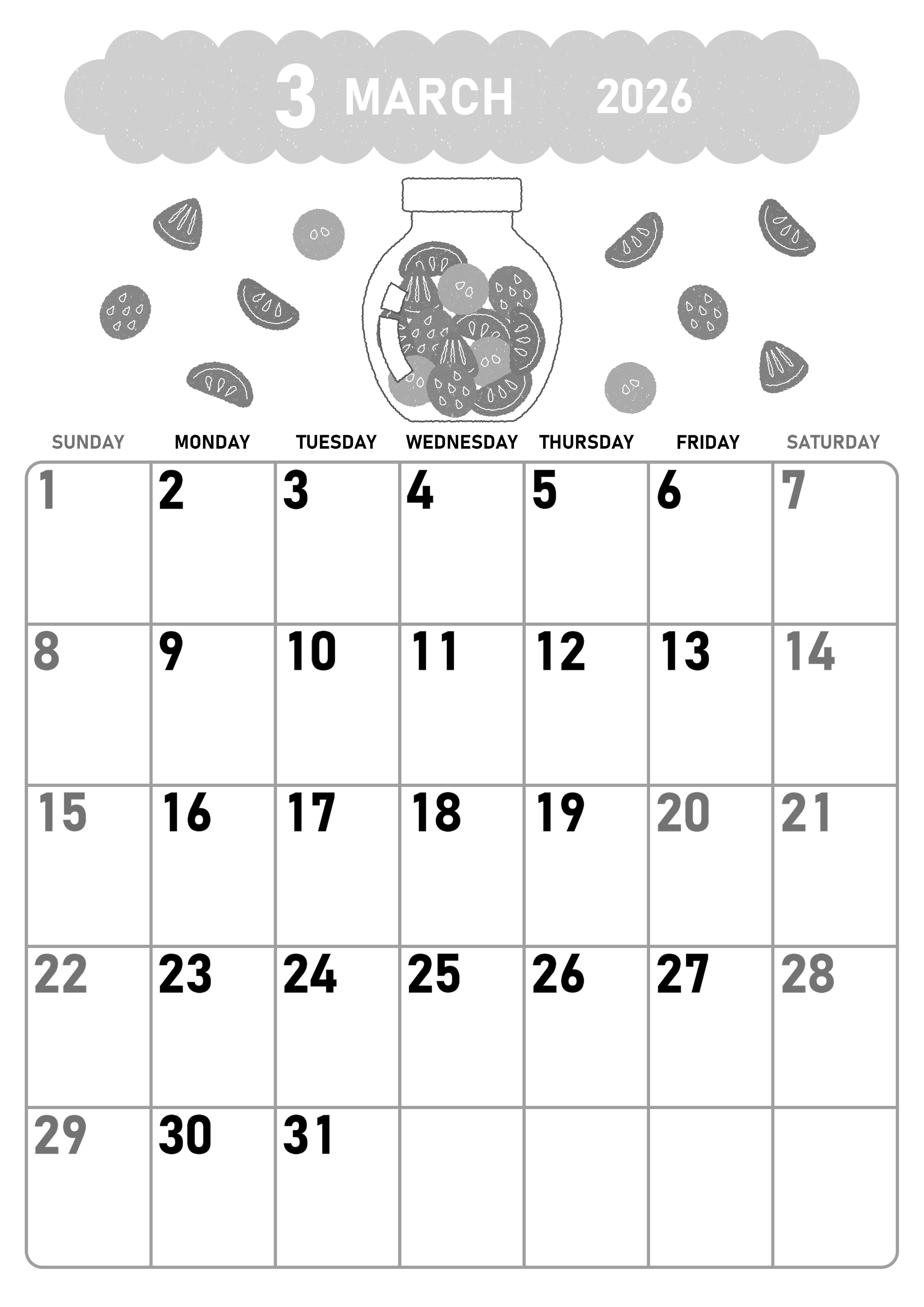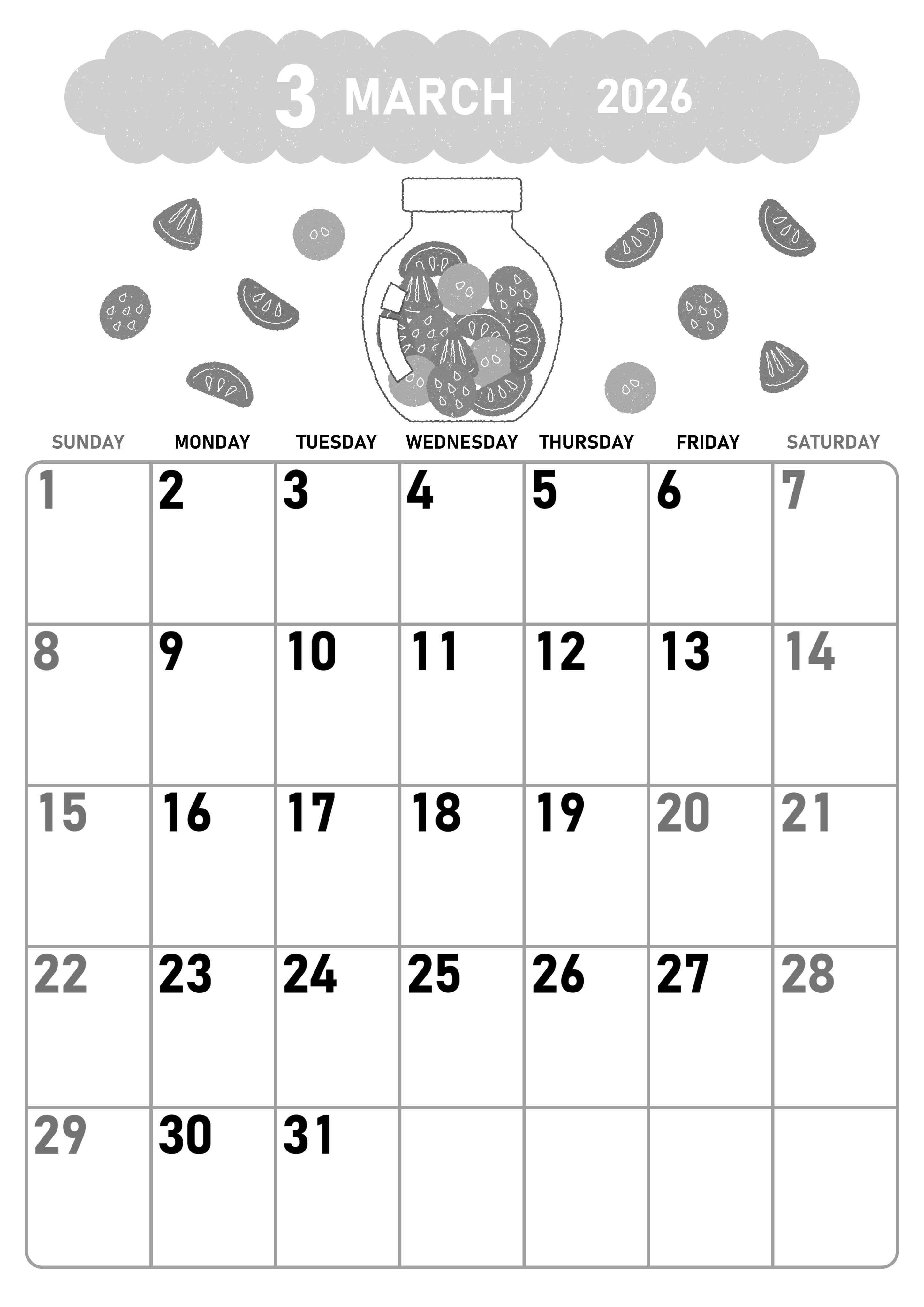 2026年3月縦型モノクロの日曜始まりの無料テンプレート白黒カレンダーです。果物の味があるバラエティ豊かなガラス瓶に詰め込まれたキャンディがカラフルでかわいいイラストのついている無料白黒カレンダーです。(2026-00420310)