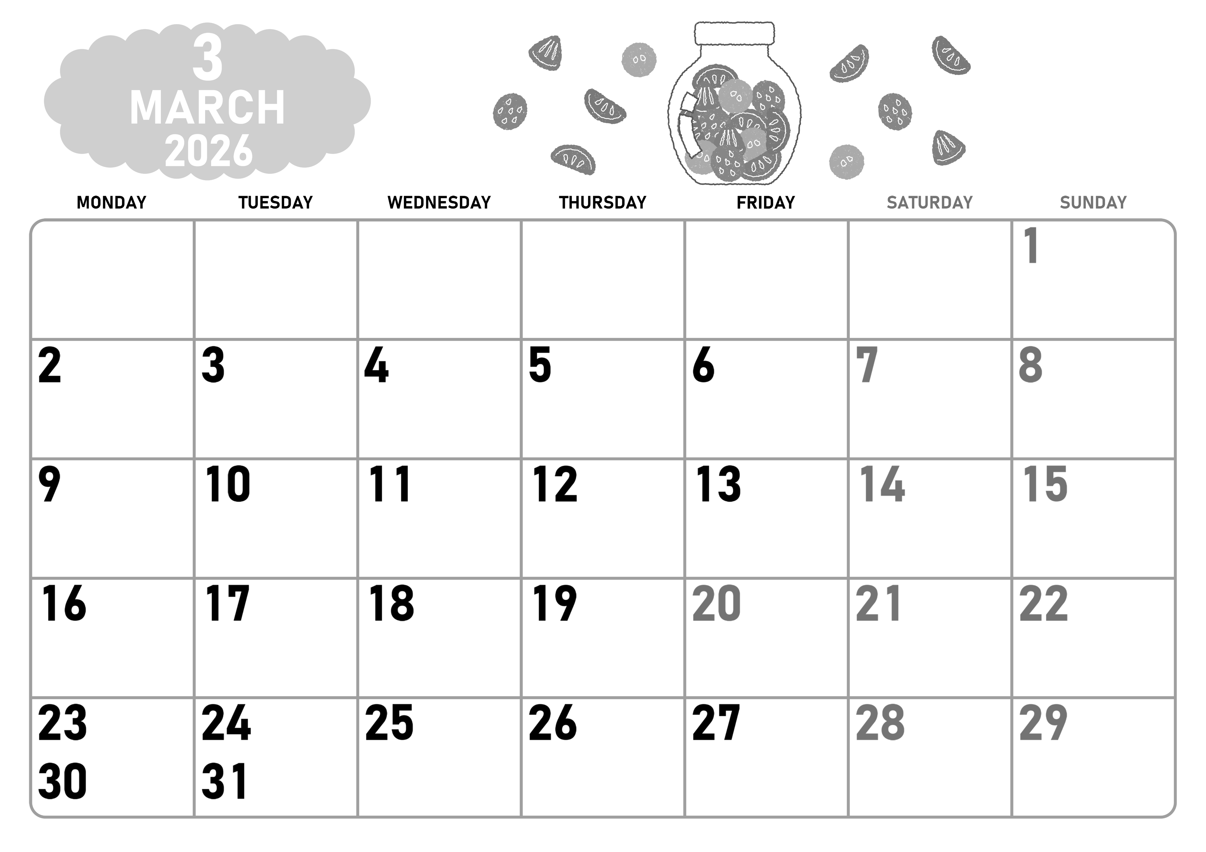 2026年3月横型モノクロの月曜始まりの無料テンプレート白黒カレンダーです。色とりどりのみずみずしい果物の飴玉がポップでかわいい元気をもらえる白黒カレンダー素材はダウンロードが無料で月曜始まりです。(2026-00420301)