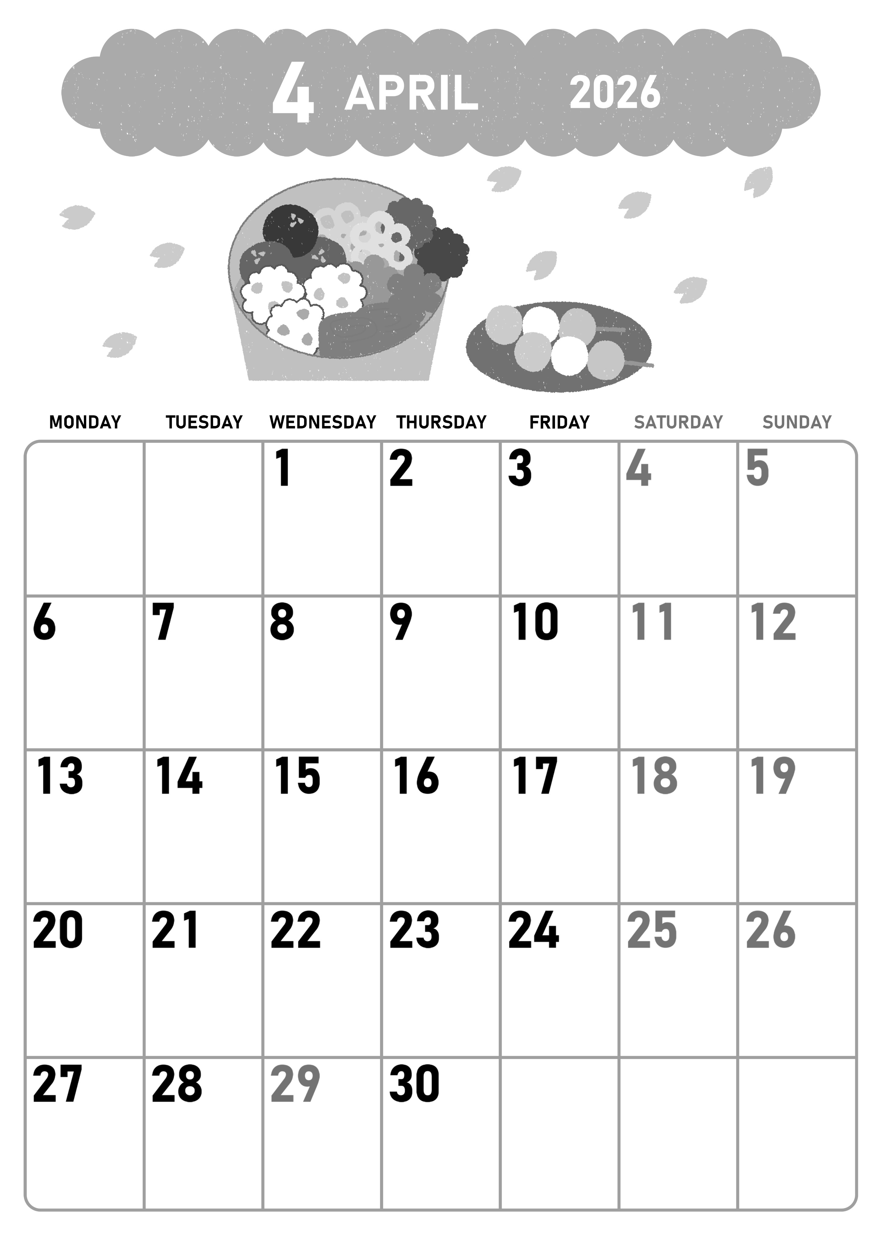 2026年4月縦型モノクロの月曜始まりの無料テンプレート白黒カレンダーです。お花見で食べる三色団子はおいしいですよね。春らしいかわいいイラストがアクセントになっているシンプルな白黒カレンダーの無料素材です。(2026-00420411)
